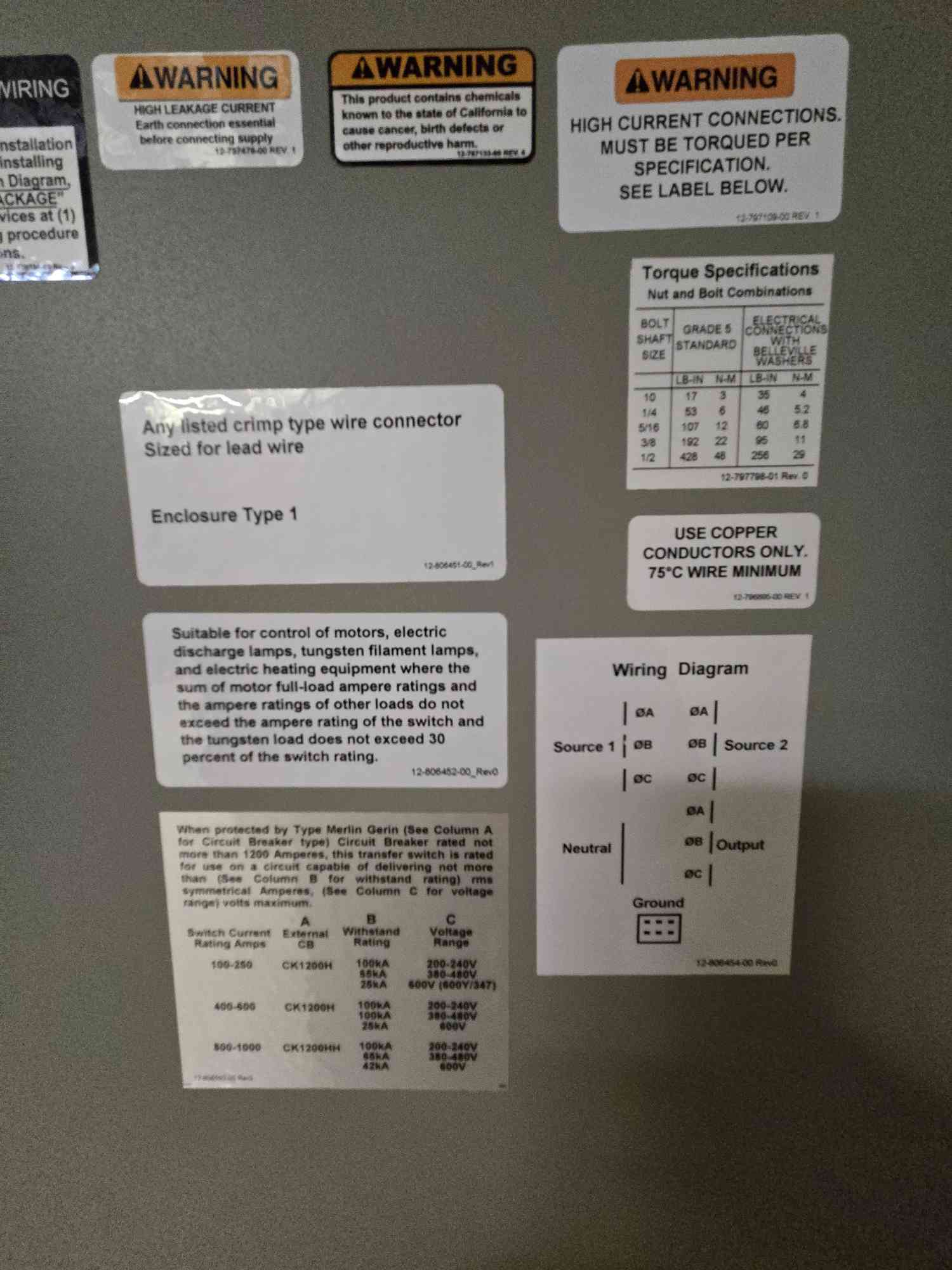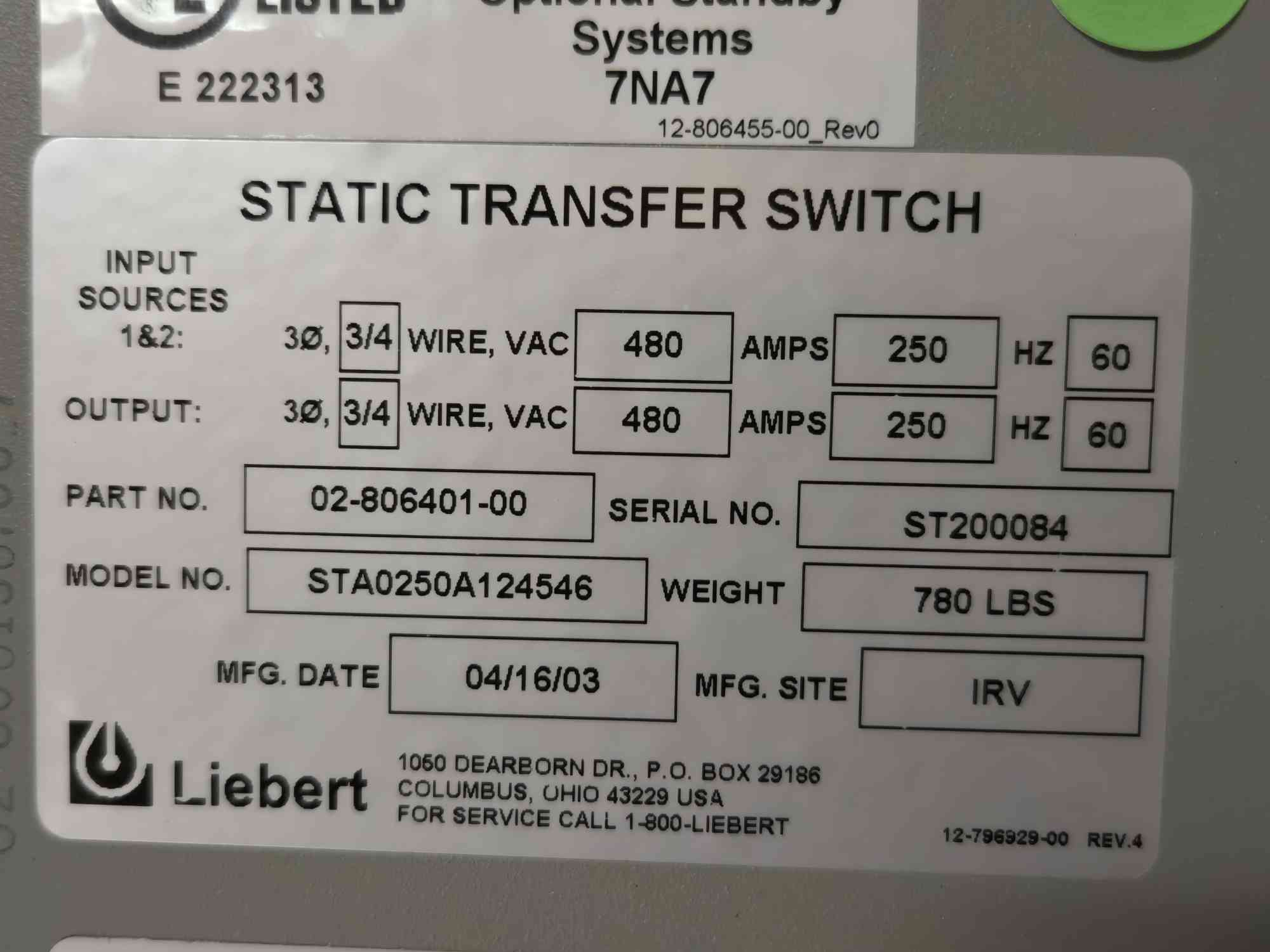 250 Amp. Liebert, Transfer Switch, 4-Wire, 480 Volts, 3PH