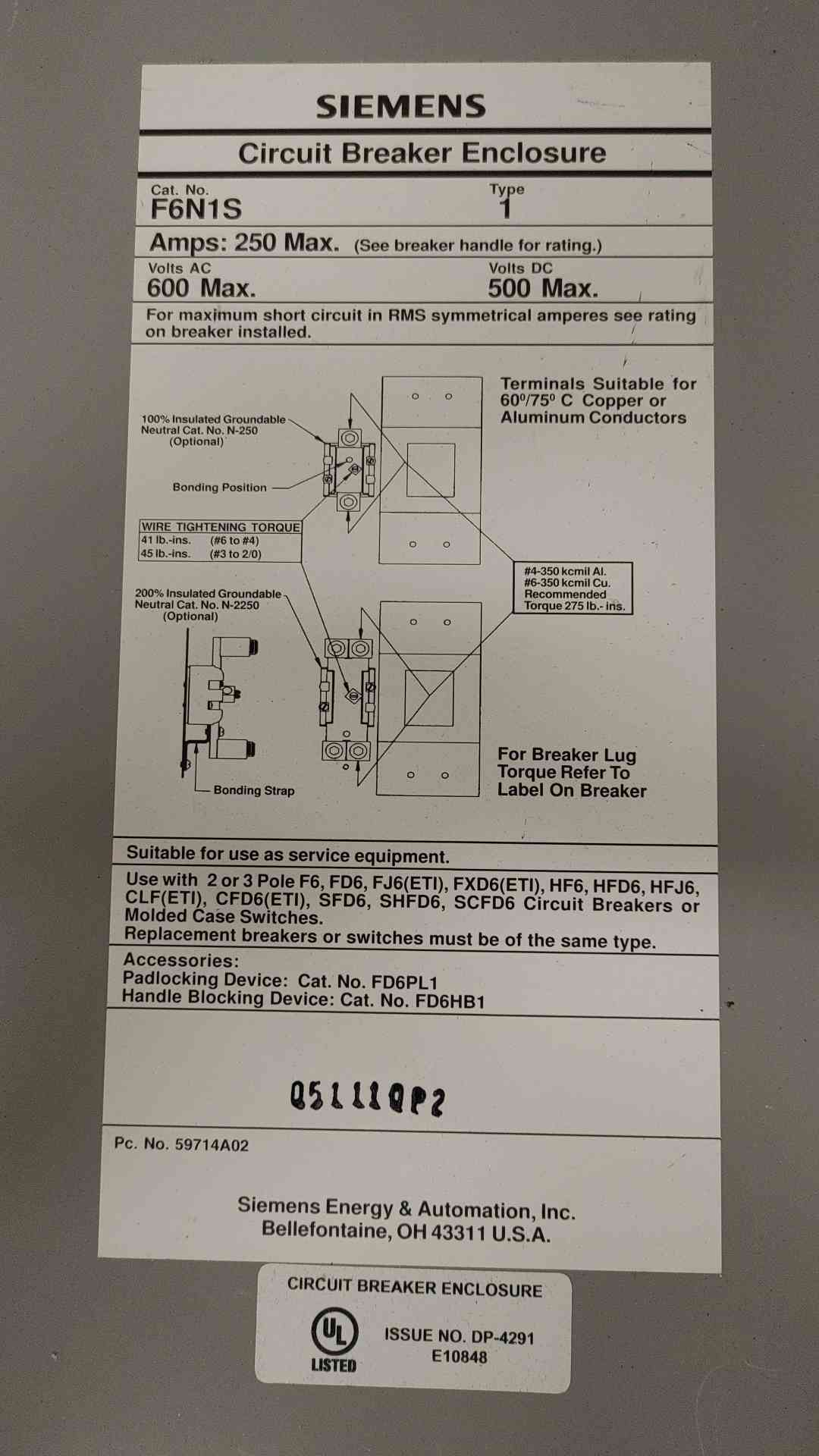 Item Dimensions - L X W X H - 11X5X39Ensure the safety and efficiency of your electrical system with the Siemens Sentron FXD638225 Circuit Breaker Enclosure. This robust panelboard is designed to handle up to 250A and operates at 600VAC, providing reliable disconnect functionalities that are essential for industrial applications. Its durable construction and straightforward installation make it a dependable choice for managing power distribution. - Rated for 250A and 600VAC, ideal for heavy-duty use- Enhances system safety with reliable disconnect mechanisms- Sturdy build ensures longevity and durability- Easy to install and integrate into existing setups No returns will be accepted due to items not in the picture. Thanks for your understandingThe equipment is used, as such it may have some blemishes, light surface scratches not affecting operation.. 30-Day Warranty & Functional Guarantee