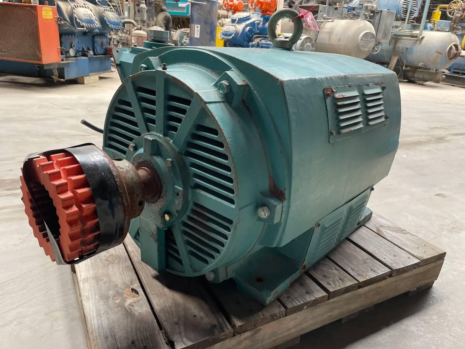 2300 / 4160 V TECO - Westinghouse Electric Motor - 250 HP. S/N: BEC42029-2. Catalog Number: P2502. Motor : 3555 rpm, 2300 / 4160 V, 56/31 amps, 60 Hz, 3 phase. Continuous duty. Enclosure Type: WP I. Frame: 449TS. Weight: 900 kg. Type: ASHA-PA001. Overall dimensions: 3 ft. 7 in. L x 3 ft. 4 in. W x 2 ft. 3 in. ...more