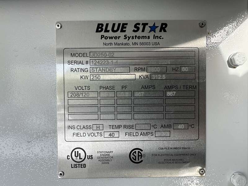 New Blue Star Power Systems / John Deere 250 kW standby (225 kW prime) diesel generator set model JD250-02, SN-124223-1-2. John Deere 6090HF484 engine rated 422 HP at 1800 RPM, EPA Tier 3 emissions, SN-RG6090L155540. 3/60/120/208V, 12 lead reconnectable to 480V and other voltages. 1000 Amp circuit breaker. PMG - ...more