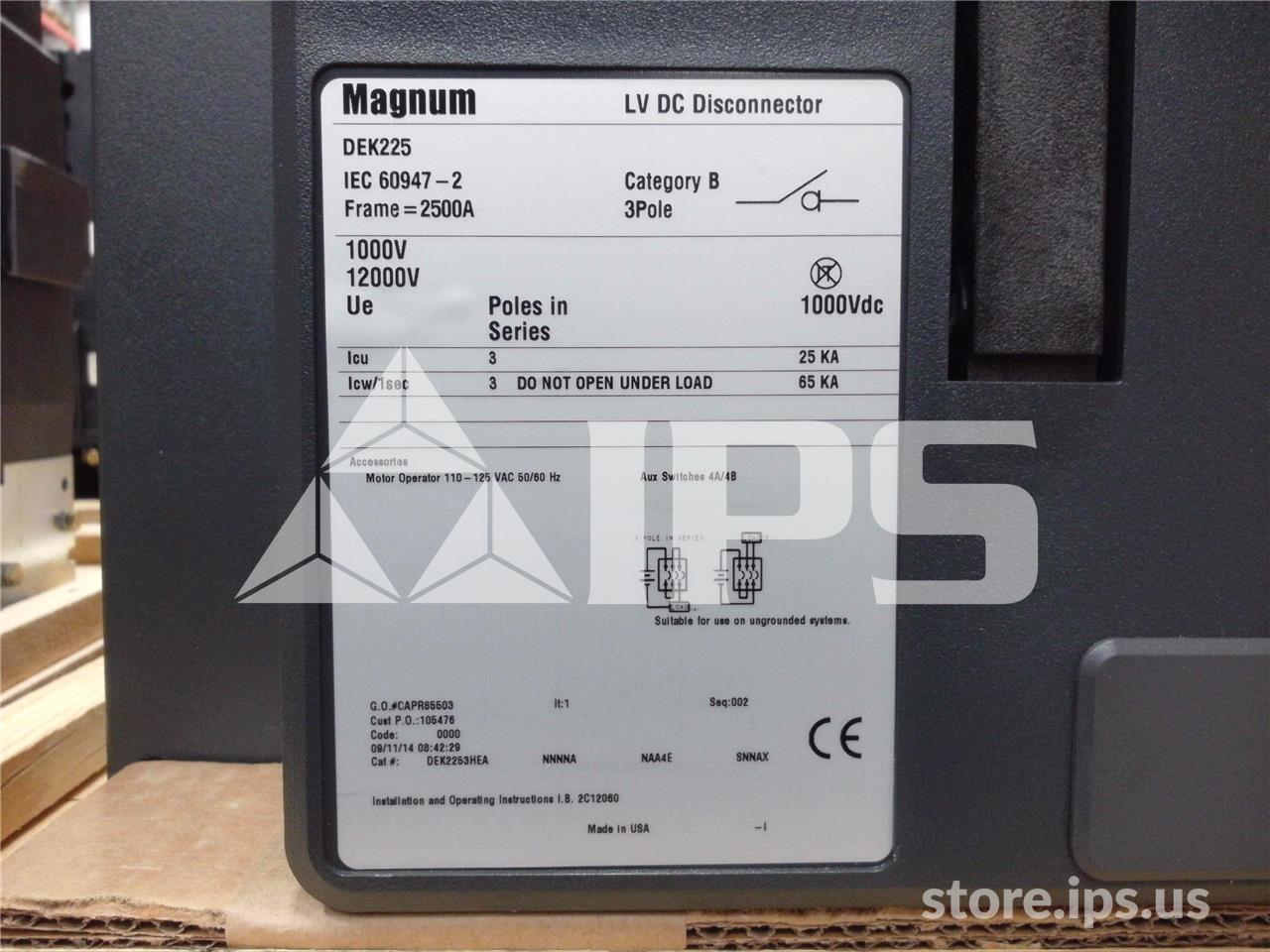 Manufacturer Westinghouse / Cutler Hammer Product Family MAGNUM DC Product Family MAGNUM DS Type of Low Voltage Switch DEK Frame Rating (Volts) 1000 Frame Rating (Amps) 2500A Frame Rating (KA) 65 Operating Mechanism Electrically Operated (Stored Energy) Racking Configuration Bolt In Shipping Width 24 in Shipping ...more