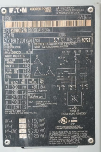 2500 KVA 12470 Primary, 460x2 Delta Secondary, Eaton Cooper Power Series substation transformer, Ser# 215 900 1278