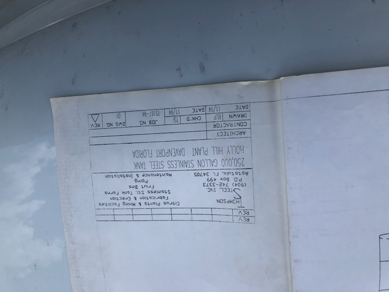 This 250,000 Gallon Food Grade Stainless Steel Storage Tank is designed for large-scale liquid storage applications requiring exceptional durability and sanitary conditions. This tank features heavy-duty food grade stainless steel construction ideal for food and beverage processing, potable water storage, dairy operations, or pharmaceutical applications. Manufactured in 1994, this tank provides substantial storage capacity with corrosion-resistant materials ensuring long-term reliability.