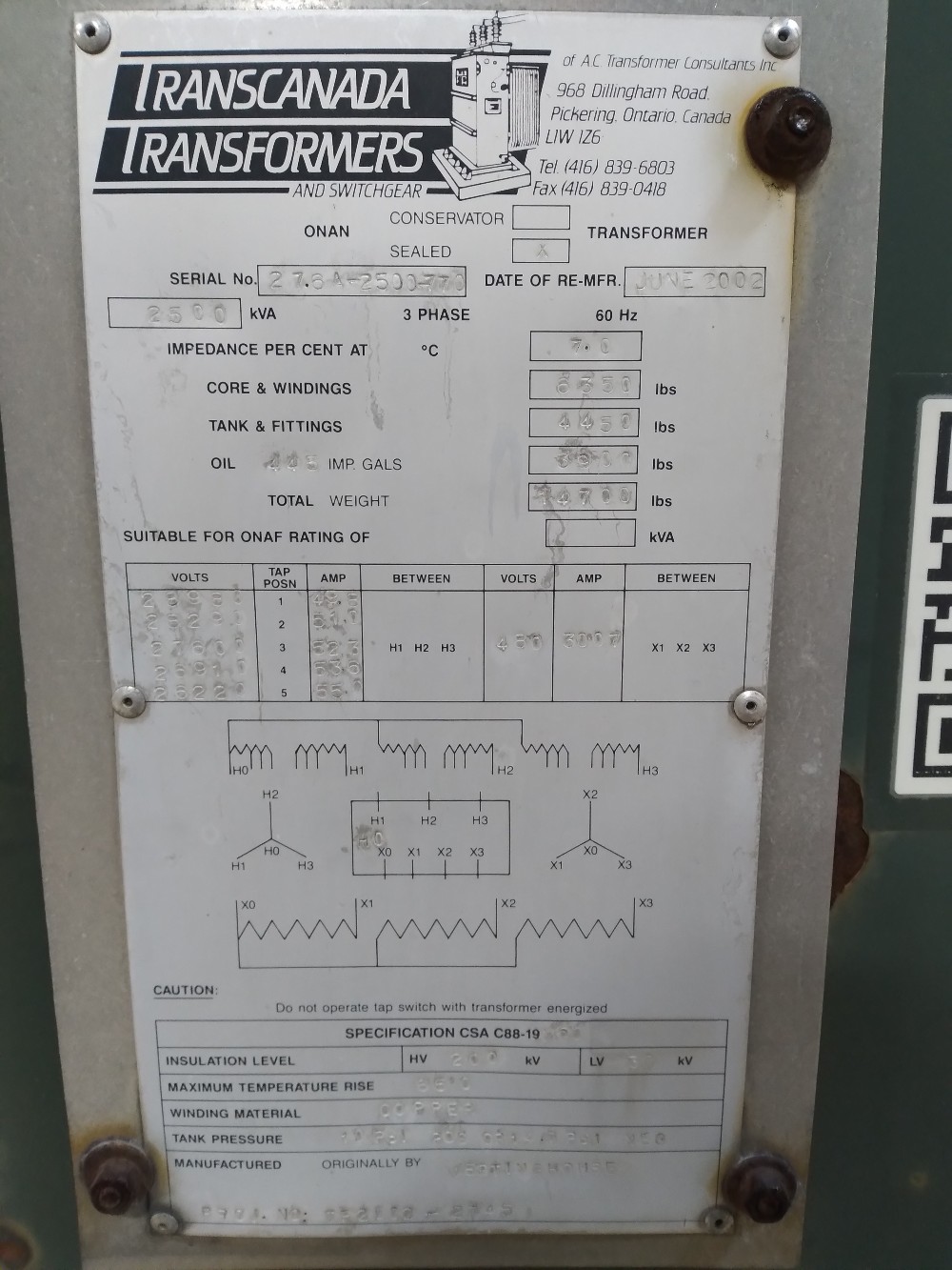 2500 KVA 25000 Delta Primary, 600Y Secondary, Station