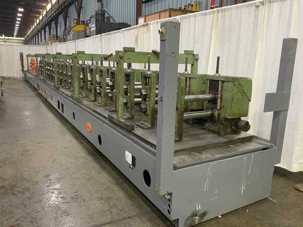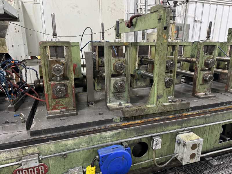 YODER M3 TUBE MILL, 9 STAND - 7 DRIVEN FORMING STANDS, 2 SIZING STANDS, 3" SHAFT, 24" HORIZONTAL CENTERS, 18" ROLL SPACE, JOG CONTROL, BEAD FLASHER/SCARFER, FLYING CUT-OFF ABRASIVE WHEEL, TOOLING: 1-5/8", 3-1/2", 2-3/8"-2-7/8", 1/2 TURKS HEAD, 40 HP DC VARIABLE SPEED DRIVE, POWER SUPPLY ...more