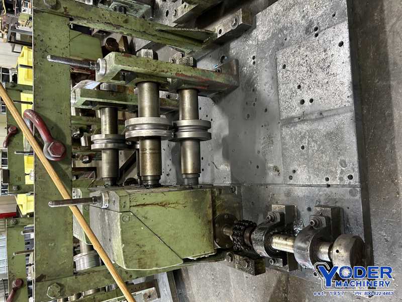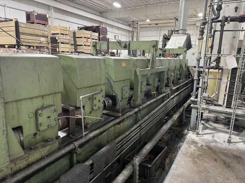 SERIAL. 86-2-62, NEW. 1986, MODEL. P915-P1815, NUMBER OF STANDS. 28 ON 30 STAND BASE, SHAFT DIAMETER. 1-1/2", ROLL SPACE. 12", VERTICAL ADJUSTMENT. 3" TO 5-1/4", BASE TOP TO LOWER SPINDLE CENTER. 4-1/2", RAFTED. YES, UNIVERSAL JOINT DRIVE. YES, EQUAL AND UNEQUAL GEAR BOXES. YES, VARIABLE SPEED DRIVE CONTROL. T B WOODS ...more