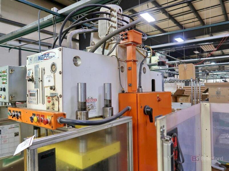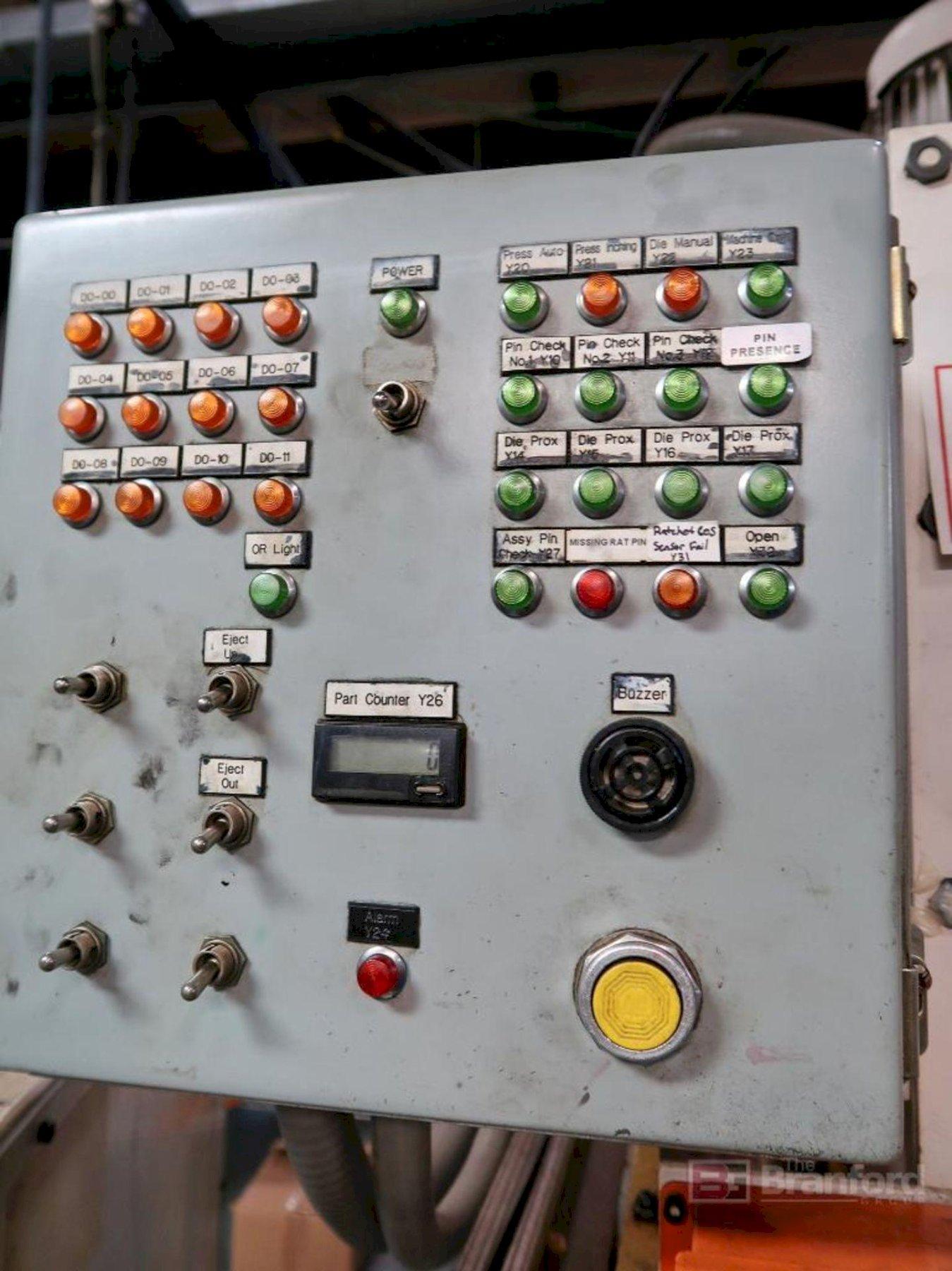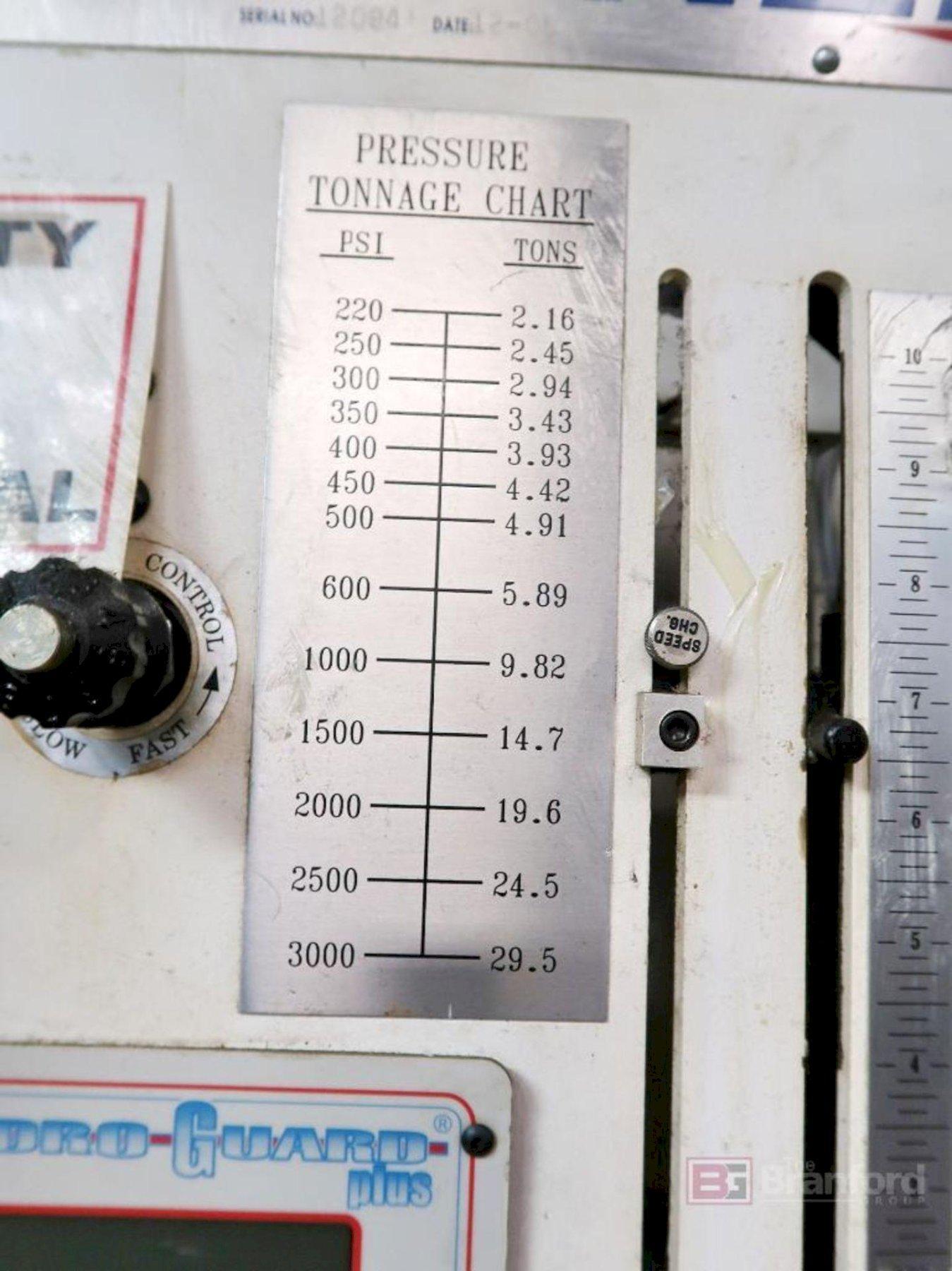 SERIAL. 1881-A985, MODEL. F530X3, CAPACITY. 30 TON, DEPTH OF THROAT. 3", STROKE. 1", MAXIMUN HOLE. 5/8" X 1/2" THICK, DIE OPENING. 1-5/16", PUSH BUTTON CONTROL. YES, HYDRAULIC UNIT SERIAL. 1952A1082, MODEL. 500 2V, PORTABLE ON ROLL AROUND CART. YES, MOTOR HORSEPOWER. 10.