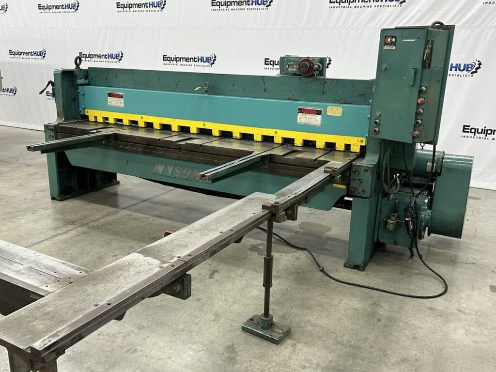 THIS WYSONG MODEL 1010 IS A MECHANICAL SHEAR SUITABLE FOR FABRICATING AND PRESSING APPLICATIONS. IT IS SPECIFIED WITH A MAXIMUM MATERIAL THICKNESS OF 0.1345 INCHES AND UTILIZES A 120-INCH BLADE LENGTH. THE SHEAR HAS A RATED CAPACITY FOR MILD STEEL OF 10 FEET BY 10 GAUGE AND FOR STAINLESS STEEL OF 10 FEET BY 12 GAUGE ...more