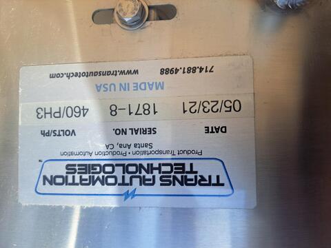 Used Trans Automation Technologies Dual Lane Conveyor. Includes two 3.5" wide x 7' long conveyor frames (no belting), mounted on stainless steel frame with 30" stand and adjustable legs. Serial Number: 1871-8.