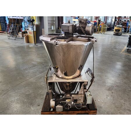 Used 3" Schenck Process MecaTron Stainless Steel Gravimetric Feeder Feeder Type: MODMS-1G-2A Coni-Steel type hopper with a 5 cu/ft capacity, clamp-on cover. 3/4HP vertical agitator, split design for easy removal (10RPM). Weigh system with two-point 300KG load cells and a summing box. 1/2HP auger drive with easy cleanout design (188RPM auger speed). Service Connection: 220VAC, 60Hz, 3ph. Feeder & weight scale controls not included.