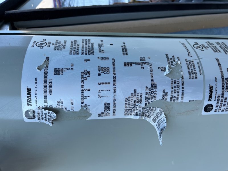 3 TON TRANE YSC036G4 GAS/ELECTRIC SEER 14 R-410A ROOFTOP AIR CONDITIONER, MAKE: TRANE, MDL: YSC036G4ELB, S/N: 200810437L, YEAR: 2/2020, PRECEDENT SERIES, UNIT: 3 TON CONVERTABLE, HEATING OUTPUT: 64800 BTU, HEATING INT: 80000 BTU, POWER: 460/60/3, SEER RATING: 14, REFRIGERANT: R-410A, APPROX WEIGHT: 600 LBS, DIMS: ...more