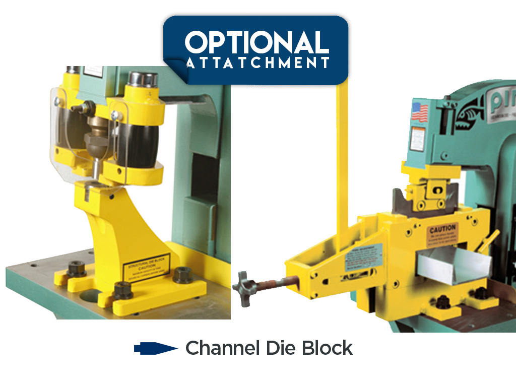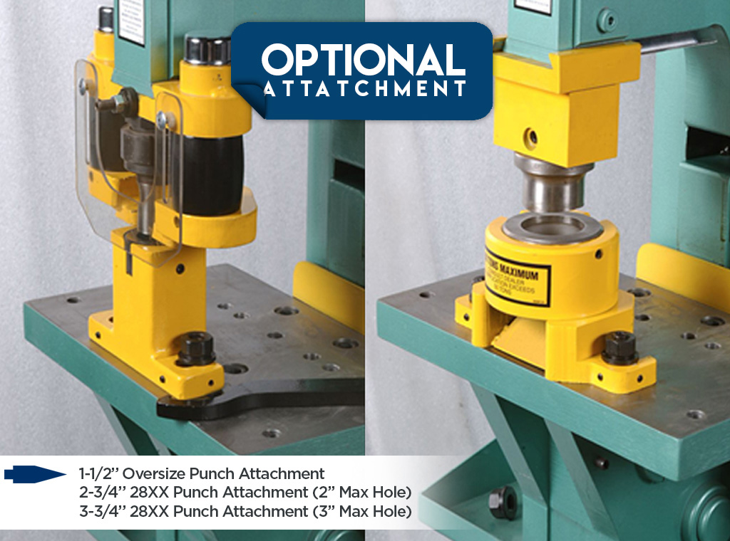 Punch Capacity 50 Ton Hole Size (Max. Material) 13/16" (3/4") Max. Hole Size (Material) 3" (3/16") Throat Depth 5" Closed Height w/o Die Block 7-3/4" Open Height 11-1/2" Stroke Length 3-3/4" Platen Table Size 8" x 16" Blade Length 13" Plate Shear Capacity 3/4" x 6" Angle Shear Capacity 3" x 3" x 3/8" Coper Notcher ...more