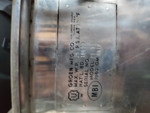 Groen 30-Gallon Steam Jacketed Kettle - Model PT 30, designed for a maximum pressure of 25 PSI and temperatures up to 300F. Jacketed for uniform heating. Includes serial number 19659 and NB# 19659.