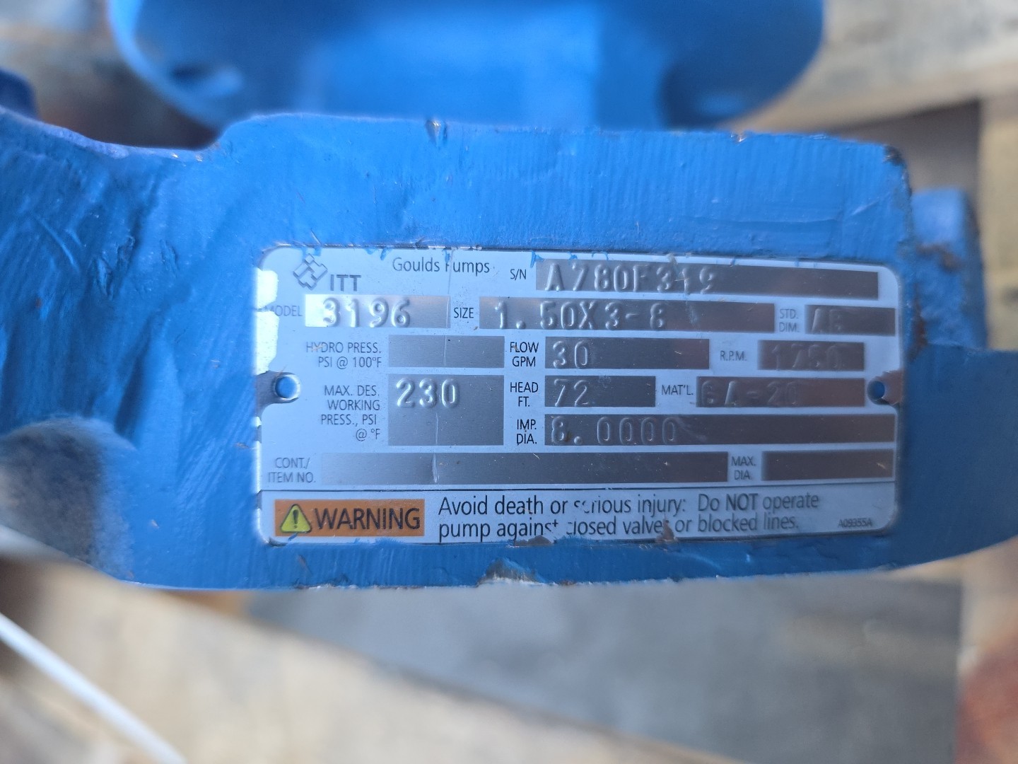 ITEM 2399-2: 15 HP GOULDS PUMP MODEL 3196 SIZE 1.50X3-13, MODEL 3196 SIZE 1.50X3-13, SERIAL # 719E663, LUBE FLOOD OIL, OUTLET: 1 5/8” DIAM OUTLET W/ 5” DIAM FLANGE, INLET: 3” DIAM W/ 7 ½” DIAM FLANGE, 15 HP MARATHON HIGH EFFICIENCY SEVERE DUTY MOTOR, 230/460 V 37.6/18.8 A, PRICE, FOB HAW ...more
