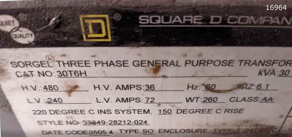 KVA 30 HV 480 Insul. Sys. 220 C LV 240 Motor 60 Hz, 3 Ph Impedance 4.20% @ 170 C Weight 340 pounds Rise 150 C.