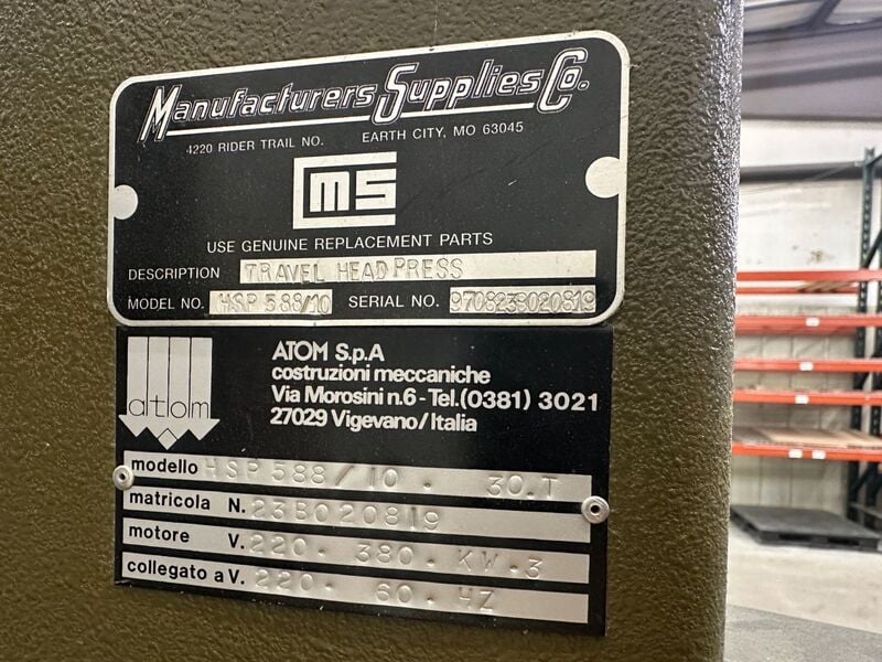 30 Ton, Atom #HSP588, manufacturers supplies traveling head hydraulic die cutting clicker press Manufacturer: Atom Model: HSP588 Ton: 30.0 Stock # 30791 Price: $9,950 USD Request Info 2 For Sale by Mohawk Machinery Inc Surplus Record Dealer Since 1956 Contact Seller Cincinnati, OH Mr. Secord 513-77...> Show Seller's Phone Number 513-771-1952 Let the seller know you found their listing on Surplus Record! View More Mohawk Machinery Inc 's ListingsDescription 30 TON ATOM MANUFACTURES SUPPLIES HSP588/10 TRAVELING-HEAD HYDRAULIC DIE CUTTING CLICKER PRESS30 TON ATOM MANUFACTURERS SUPPLIES TRAVELING-HEADHYDRAULIC DIE-CUTTING/CLICKER PRESSManufacturers Supplies Serial No 9708239020219,Atom SPA Serial No 23B020819Model No HSP588/10EQUIPPED WITH:Synchronized ControlsDynamic Head Breaking SystemRemoveable Polyurethane Cutting TableCATALOG SPECIFICATIONS:Cutting Pressure, Maximum 30 TONS 294 kNCutting Head Size, L x W 29.5 x 29.5"Cutting Head Size, L x W 750 MM x 750 MMCutting Working Surface, L x W 78.75" x 29.5"Cutting Working Surface, L x W 2000 MM x 750 MMCutting Stroke, Variable to 6 150 MMDaylight Opening 7" 178 MMOverall Dimensions, L x W 98.4" x 65.3"Overall Dimensions, L x W 2500 MM x 1660 MMOverall Height 92.9"Overall Heihjt 2360 MMWeight Approximately .......... 4994 LBS 2270 KGNOTE: This Machine Was Designed To Cut Leather, Textiles,Plastic, Cardboard, Rubber, ETC..F.O.B. OUR WAREHOUSE Request More Information from SellerInquire Further with Mohawk Machinery Inc! "*" indicates required fieldsName*Company*Email* PhoneZip / Postal Code*QuestionMake an OfferRequests Send me a shipping quote I am interested in financingSend Copy Email me a confirmation of this inquiryBuyer Protection Use our partner Escrow.com to buy or sell equipment safelyBuyer Protection Send me info about buyer protectionThis field is hidden when viewing the formDealer Email Buyers Who Viewed This Listing Also Viewed …JUST ADDED! 30 Ton, Atom #HSP-588/10, hydraulic clicker press, traveling head, 29" x 82" BedCategory: Die Cutting Press MachinesSeller: C.W. Wood Machinery IncLocation: Cincinnati, OH Mfr: AtomModel: HSP-588/10ATOM HYDRAULIC CLICKER PRESS, MODEL: HSP 588/10, SERIAL NUMBER: 960822B020607, "Hydraulic die-cutting machine that is designed for cutting materials like rubber, foam, paper or plastic.", Traveling Head, Maximum Cutting Force: 30 Tons, Cutting Stroke: 0 - 6", Cutting Table: 82-5/8" x 29-1/2", Cutting Head: 29-1/4" x ...moreJUST ADDED! 30 Ton, Associated Pacific Machine Corp #APM-SA27L, Swing Arm Clicker Press, 20" x 40" bed, 24" beam, 3.54 stroke, 5.1" daylight, 2 HP, 220 Volt, 2021Category: Die Cutting Press MachinesSeller: Naab Sales CorporationLocation: Blaine, MN Mfr: AssociatedModel: APM-SA27LYear: 2021Here We Have:, Associated Pacific Swing Arm Clicker Press, Make: Associated Pacific Machine Corp, Model: APM-SA27L, Serial No. 2000547-2, New In 2021, Capacity: 30 Ton US, Beam Size: 24”, Bed Area: 20” x 40”, Max. Cutting Stroke: 3.54” (Adjustable), Max. Daylight Opening: 5.1”, Main ...more 30 Ton, Hudson #NF-500CL, precision sheet hydraulic die cutting pressCategory: Die Cutting Press MachinesSeller: TNT IndustrialLocation: Orange, CA Mfr: HudsonModel: NF-500CLHUDSON MACHINERY MODEL NF-500CL PRECISION SHEET HYDRAULIC DIE CUTTING PRESS 30 TON. 30 Ton, APMC #FH2663-30M, hydraulic clicker press, single manual slide table, polypropylene cutting padCategory: Die Cutting Press MachinesSeller: Sterling Machinery Exchange - New Mach.Location: South El Monte, CA Mfr: ApmcModel: FH2663-30MTonnage 30 T Length 25 in Width 63 in.JUST ADDED! 27 Ton, Hudson #HY27-20, Die Cutting Clicker Press, 20" x 40" cutting bed, 20" beam width, 5" max. daylight, 2 HP pump motorCategory: Die Cutting Press MachinesSeller: Harris Machine Tools, Inc.Location: Houston, TX Mfr: HudsonModel: HY27-20CUTTING FORCE: 27 TONS, CUTTING BED SIZE: 20" X 40", BEAM WIDTH: 20", MAXIMUM OPEN DAYLIGHT: 5", MINIMUM OPEN DAYLIGHT: 1.4", PUMP MOTOR: 2.0 HP, NET WEIGHT: 2,500 LBS., DIMENSIONS: 40" X 41" X 56".Share × "*" indicates required fieldsYour Name*Your Email* Recipient's Email* Note to Recipient