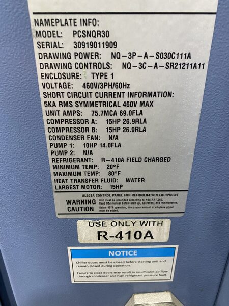 30 Ton, Advantage #CC-30WPT-21HRX, Water Cooled Chiller, R-22, (2) Refrigerant Zones, (2) 15 HP Compressors, 208 V, 2005