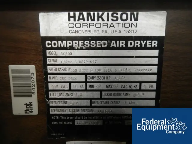 Used Hankison compressed air dryer, model 80300, R12 refrigerant, 1.5 HP, rated 300 CFM @ 100 PSI and 100 degree F inlet air temp, serial # 0324A-3-0879-047