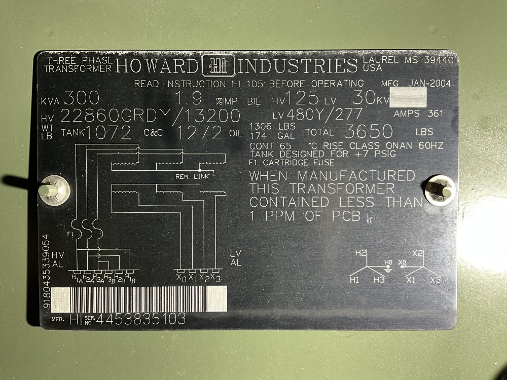 300 KVA 24940Y/14400 Primary, 480Y/277 Secondary, 3 Phase, pad mount, 105 taps (3 available)
