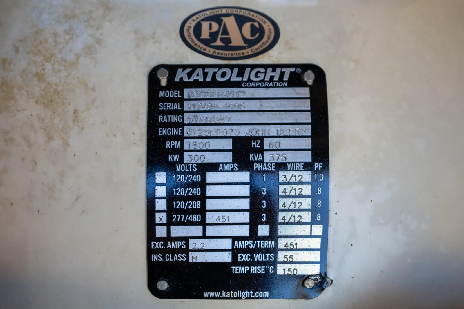 Used Katolight 300kW Diesel generator. This Standby power unit is enclosed and has approximately 318 hours of use. It provides Three-Phase power at 277/480v and is ready to ship from our Jacksonville, Florida facility.
