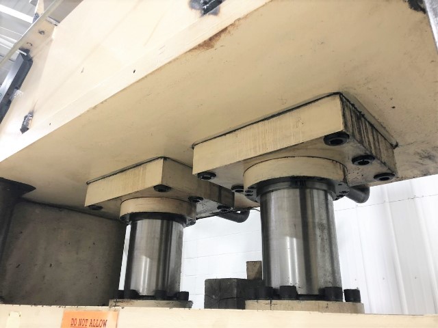 CAPACITY 300 TONS @ 1948 PSI MAX. STROKE 6" MAX. DAYLIGHT TO BED 17.25" (11.25 max shut height) BED & RAM AREA 98" X 52" (RL X FB) DISTANCE BETWEEN POSTS 74" X 34" (RL X FB) USABLE BED & RAM AREA 74" X 52" (RL X FB) SPEED -- POST SIZE 5.5" DIA. CYLINDER SIZE 14" dia. bore - (TWO CYLINDERS) HYDRAULIC 300 GAL. HYDRAULIC TANK (MOBIL D.T.E. 26) ELECTRICS 75 HP 230/460V-3-60 ELEKTRIM MOTOR 182/91 AMPS | 1191 RPM CONTROLS ALLEN-BRADLEY SLC 5/02 CONTROLLER FLOOR TO BED 40" APPROX. OVERALL DIMENSIONS 128" X 65" (RL X FB) X 202" HIGH APPROX. WEIGHT APPROX. 55,000 LBS.