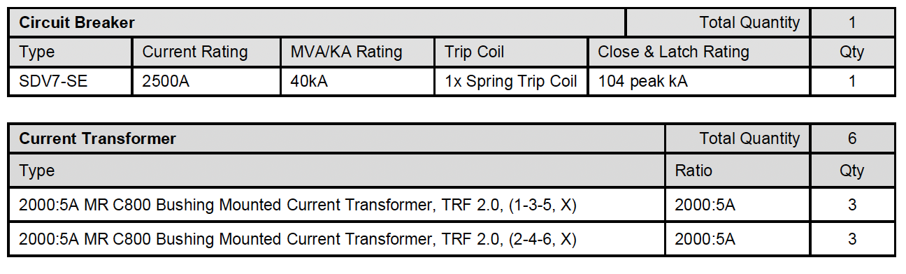 Siemens SDV7-SE Outdoor Vacuum Circuit Breakers (x6)- Design: SDV-7, non–arc vented- Voltage Class: 38 kV- Rated Continuous Current: 2500 A- Interrupting Rating: 40 kA- Closing & Latching Current: 104 kA peak- Frequency: 60 Hz- BIL: 200 kV- Trip Mechanism: 1× spring trip coil- CTs Included:- (6) 2000:5A MR C800, bushing-mounted- (3) for phases 1-3-5, (3) for 2-4-6- Accuracy class C800 (high accuracy, relaying grade)General ApplicationThis is a medium-voltage (MV) outdoor vacuum breaker, typically used in:- Utility substations- Industrial primary distribution (38 kV class)- Transformer primary protection- Feeder breakersLead time for a new Siemens SDV7 breaker is typically:- 24–40 weeks (standard)- Up to 52+ weeks for high-current models with custom CTsThis long lead time is why surplus units often move quickly.Click REQUEST QUOTE anywhere you see it on our site to receive a quote, with Pricing and Specs, directly to your email!!* All Descriptions, Specifications and Features are correct to the best of our knowledge. Interested buyers should verify before purchasing.