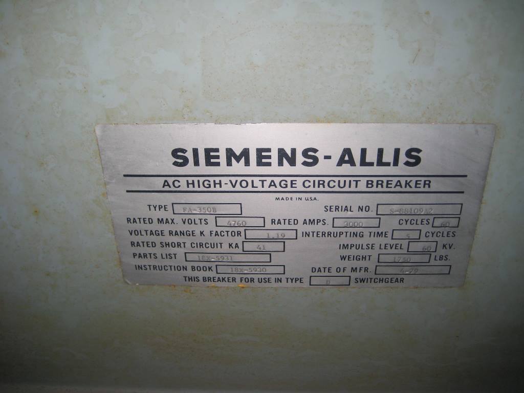 3000 Amp, SIEMENS, FA-350B, 4160 Volts, 41 KA EO/DO, 125 VDC CL/TR/MOT Manufacturer: Siemens Model: FA-350B Year: 1979 Amps: 3000 Type: fa-350b Stock # CB-17809 Request a Quote 6 For Sale by Belyea Company Inc Surplus Record Dealer Since 1926 Contact Seller Easton, PA Shepard Belyea 610-51...> Show Seller's Phone Number 610-515-8775 Let the seller know you found their listing on Surplus Record! View More Belyea Company Inc 's ListingsDescription CB-17809(1EA) 3000 AMP SIEMENS ALLIS AIR CIRCUIT BREAKERTYPE FA-350B4160 VOLT4760 MAX. VOLT1.19 VOLTAGE RANGE K FACTOR5 CYCLE INTERRUPT41 KA SHORT CIRCUIT60 KV BIL1750 LBS.INST. BOOK 18X-5930PARTS LIST 18X-5931FOR USE IN TYPE D SWITCHGEARSTORED ENERGY OPERATOR TYPE 515-3125 VDC CLOSE/TRIP/MOTORWIRING DIAGRAM 18 723 364 402SN: S-88109A2 Request More Information from SellerGet Your Price from Belyea Company Inc! "*" indicates required fieldsName*Company*Email* PhoneZip / Postal Code*QuestionMake an OfferRequests Send me a shipping quote I am interested in financingSend Copy Email me a confirmation of this inquiryBuyer Protection Use our partner Escrow.com to buy or sell equipment safelyBuyer Protection Send me info about buyer protectionThis field is hidden when viewing the formDealer Email Buyers Who Viewed This Listing Also Viewed … 3000 Amp, GENERAL ELECTRIC, VB4.16-350-0, 5000 Volts, EO/DO, 125VDC CLOSE & TRIPCategory: Medium Voltage Air Circuit BreakersSeller: Belyea Company IncLocation: Easton, PA Mfr: General ElectricModel: VB4.16-350-0ONE (1) - ELECTRIC VACUUM BREAKER, - 3000A, - 4.76KV, - TYPE VB4.16-350-0, - DRAWOUT, - ELECTRICALLY OPERATED (125VDC), - ML-17 OPERATING MECHANISM, - 3PH/60HZ. 3000 Amps, ITE, 5HK, 4.76KV, electrically operated, drawoutCategory: Medium Voltage Air Circuit BreakersSeller: Bullock BreakersLocation: Annandale, MN Mfr: IteModel: 5HK 3000 Amps, Allis-Chalmers, FA-350A, electrically operated, drawout, #AB0460Category: Medium Voltage Air Circuit BreakersSeller: RESA Power SolutionsLocation: Cerritos, CA Mfr: Allis-ChalmersModel: FA-350AAllis Chalmers Circuit Breaker, Air Breakers type, Catalog Number FA-350A, 3000 amp frame current, 5000 volts, Electric operation, Drawout mounting. 3000 Amps, General Electric, AM-4.16-350-2HCategory: Medium Voltage Air Circuit BreakersSeller: National Power Equipment Inc.Location: Brook Park, OH Mfr: General ElectricModel: AM-4.16-350-2H 3000 Amps, Siemens, -5-gmi-350-3000-, electrically operated, drawout, 4160 Volts, surplusCategory: Medium Voltage Air Circuit BreakersSeller: EMSCOLocation: Fridley, MN Mfr: SiemensModel: -5-GMI-350-3000-Share × "*" indicates required fieldsYour Name*Your Email* Recipient's Email* Note to Recipient