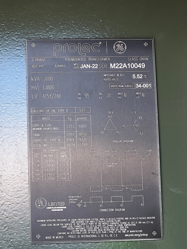Overview For sale is a GE Prolec 3000 KVA padmount transformer in excellent working condition. This unit was installed and put into service in April 2022 at our facility and has been professionally maintained throughout its service life. The transformer is being sold due to facility changes.