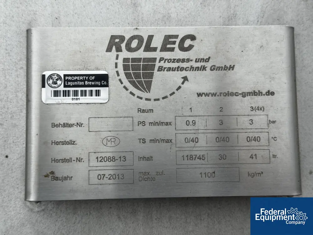 Used 118,745 liter (31,372 gallon) M Roth GmbH storage tank, 304 stainless steel construction, approximately 3,900mm (153.54") inner diameter x 8,500mm (334") straight side, dish top, 55 degree cone bottom, approximately 2,400mm (94.48") deep, rated 0.9 bar at 40°C internal, jacketed cone and 196" of straight side in (4) zones rated 3 bar at 40°C, on (4) stainless steel legs with approximately 40" discharge height, approximately 4,100mm (161.41") outside diameter approximately 534" overall height, with 164.5" overall width and height prone position shipping dimension, serial# 12088-13, built 2013.