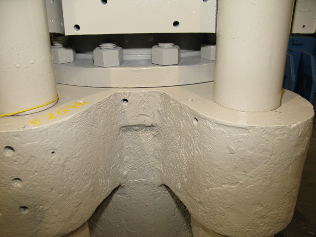 28" CLEARANCE L TO R BETWEEN THE POSTS; 11" CLEARANCE F TO B. NOMINAL BED SIZE IS 27" X 25". RAM IS APPROX 20" DIAMETER; SINGLE-ACTING; WITH APPROX 20" MAX STROKE. MAX DAYLIGHT IS APPROX 21". POSTS ARE 5" DIAMETER WITH HALF-SURROUND GUIDES. APPROX 41" OPERATOR HEIGHT. 2" PORTS. APPROX 46" X 32" X 78" TALL. APPROX 8,000 POUNDS. ITEM #2046