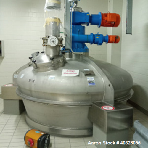 a. bolz gmbh & co kg vertical conical batch (nauta type) mixer, model mf400. material of construction is 316 (v4a 1.4401/04) on product contact parts. inside polished to corn 240. total capacity 326.66 cu ft. (9250 liters), working capacity 141.25 cu. ft. (4000 liters). not jacketed. inside rated for 1.5 psi (0.1 bar) at 176 deg f (80 deg c). screw mixing device driven via a gearbox by (1) x loher, type engv 160mb-160mb-04c 400-volt/50cycle/3ph & (1) loher, type encv-090lb-04 c 1.35 kw-400volt/50cycle/3ph explosion-proof motors. incl. manway and bottom outlet. hanging type incl. 3 claws. overall dimensions 91" (2800 mm) x 91" (2800 mm) x 162" (5000 mm) high. weight empty approx. 4 tonnes. previously used in a pharma application. our freight specialists can assist you with door to door transportation and all customs documents needed to make the process go as smoothly as possible.