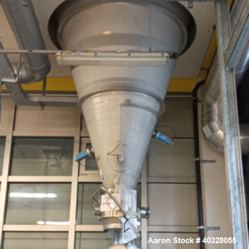Stainless Steel Nauta Mixer, approximately 50 cubic feet capacity, measures 6' diameter x 8' deep, 60 degree cone with 10" diameter center bottom outlet with dust tight valve. Includes welded side connection at bottom of cone with manually operated 10" x 6" valve on bottom side of cone, with access door on ...more