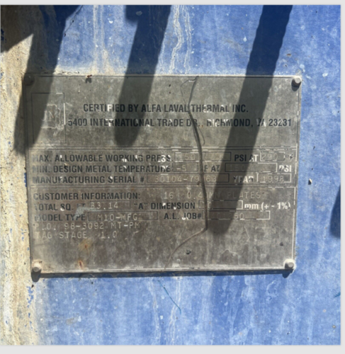 33 sq.ft., Alfa-Laval, M10, Heat Exchanger Manufacturer: Alfa-Laval sq.ft.: 33 Description: m10 Price: $700 USD Request Info 3 For Sale by American Industrial Sales LLC Surplus Record Dealer Since 2010 Contact Seller Berlin, WI Nick Thoma 920-36...> Show Seller's Phone Number 920-361-5208 Let the seller know you found their listing on Surplus Record! View More American Industrial Sales LLC 's ListingsDescriptionAlfa Laval Plate Heat ExchangerType: Gasketed Plate and Frame Heat ExchangerProduct Specifications:MAWP: 150 psi @ 290 FMDMT: -5 @ 150 PSIModel: M10Area: 33.14 sq. ft.A-DIM: 70 mmWe have over 30 different usedheat exchangers available. If this is not what you are looking for, calland we may have it.AIS, LLC.We have the largest supply of used/refurbished powder coatingequipment in the World! If you have questions or need additionalinformation on this item or would like to inquire about any other equipmentneeds, please contact Rob.American Industrial Sales, LLC (AIS) is a complete systems houseof new & used Industrial Finishing Systems and home to the world's largestinventory of used Powder Coating and E-coating equipment including overheadconveyors, ovens, washers, etc. We have more than 20 years of experiencein the design, manufacture, and installation of finishing systems includingpowder coating, liquid coating and electrocoating. We offer our customers newsystems, refurbished systems, removal, relocation and upgrading services for existingequipment. In our time in business, we have provided our services and systemsto a large variety of companies throughout the Northern Hemisphere. At AIS, wetake into account important factors such as product size, production rates,product handling, energy efficiency, floor space, and budgets in order toprovide the fastest and best design layouts, systems, and delivery times in theindustry. We pride ourselves in supplying quality equipment at a competitiveprice with on-time delivery.**Contact us forshipping information and freight quote****Freight shipping is available** We will palatalize and load truck at nocharge! Contact us for information you need to set up pick-up for your itemwith your preferred carrier**PICK UP AND CARRIER IS TO BE SCHEDULEDBY BUYER.Next Day and Second DayAir service is available for an additional fee.Next Day and Second DayAir service and all International Orders will be charged an appropriate rate.Return Policy:If you are dissatisfied with a product from us, you may return or exchange theproduct within 30 calendar days of the invoice date.Shipping charges to be paid by buyer for all returns.Please contact us for any exchanges or discrepancies with your purchase. Request More Information from SellerInquire Further with American Industrial Sales LLC! "*" indicates required fieldsName*Company*Email* PhoneZip / Postal Code*QuestionMake an OfferRequests Send me a shipping quote I am interested in financingSend Copy Email me a confirmation of this inquiryBuyer Protection Use our partner Escrow.com to buy or sell equipment safelyBuyer Protection Send me info about buyer protectionThis field is hidden when viewing the formDealer Email Buyers Who Viewed This Listing Also Viewed … 30 sq.ft., Alfa-Laval #M6-MFG, Stainless Steel Plate Heat Exchanger, Vertical, Carbon Steel Frame, Stainless Steel Plates, 150 psi/FV @ 300°F, 2015Category: Plate and Frame Heat ExchangersSeller: Perry Videx LLCLocation: Hainesport, NJ Mfr: Alfa-LavalYear: 2015Used 30 square foot vertical plate heat exchanger., Manufactured by Alfa Laval, Model M6-MFG, EPDMP clip-on plate exchanger gaskets, 316 stainless steel plates, Carbon steel frame, 150 psi/full vacuum @ 300F, Built 2015, 2015 ALFA LAVAL M6-MFG. 35 sq.ft., Alfa-Laval, 16FG, 150 psi @ 250°F, Carbon Steel frame, 316 Stainless Steel platesCategory: Plate and Frame Heat ExchangersSeller: Louisiana Chemical Equip CoLocation: Baton Rouge, LA Mfr: Alfa-LavalITEM NO : 110770 QTY : 1 ALLOY : S SQ.FT. : 34 MATERIAL (S) : CS FRAME MATERIAL (T) : 316SS PLATES PSI (S) : 150 PSI (T) : 150 TEMP. DEG. F (S) : 250 TEMP. DEG. F (T) : 250 V/H : V PREVIOUS SERVICE: 25% NaOH CAUSTIC; ESS-285; MFG. BY ALFA LAVAL; MODEL #16FG; BOTH SIDES RATED FOR 150 PSI @ 250 DEG. F.;. 30 sq.ft., Tranter, PF15, plate heat exchangers, (37) 9-3/4" x 28" S/S plates, 2" inlet/outlet, 150 psi @ 230°F, 1991Category: Plate and Frame Heat ExchangersSeller: Machinery & Equipment CoLocation: Brisbane, CA Mfr: TranterYear: 1991ITT Standard plate heat exchangers. Unit has 37 plates, 9-3/4" x 28" for approx. 30 sq/flat top surface area with 2" inlet/outlet. Unit is stainless steel product contact parts rated for 150 PSI @ 230 Deg F, model PF15, manufactured new in 1991, serial number 91U50200-01, national board number 50412. Square Feet: 30 ...more 36 sq.ft., APV, SR15, Carbon Steel frame, 316 Stainless Steel plates, 150 psi, 32 plates, 350°F, 1984Category: Plate and Frame Heat ExchangersSeller: Louisiana Chemical Equip CoLocation: Baton Rouge, LA Mfr: ApvYear: 1984ITEM NO : 66358 QTY : 1 ALLOY : S SQ.FT. : 36 MATERIAL (S) : CS FRAME MATERIAL (T) : 316LSS PLATES PSI (S) : 150 PSI (T) : 150 TEMP. DEG. F (S) : 350 TEMP. DEG. F (T) : 350 TUBE HOLES : 32 PLATES V/H : V CODE : NB TEMA TYPE : PLATE SHELL NOZZLES : 2-1.5" TUBE NOZZLES : 2-1.5" NO. OF BAFFLES : - BAFFLE ...more 32 sq.ft., Alfa-Laval, Plate Heat Exchanger, (16) 17" W x 47" H x 3/8" thick graphite plates, 21 liter volume, 8 bar, 180°C, 1997Category: Plate and Frame Heat ExchangersSeller: Machinery & Equipment CoLocation: Brisbane, CA Mfr: Alfa-LavalYear: 1997Plate heat exchanger, 32 sq. ft., (16) graphite plates, 17" wide x 47" high x 3/8" thick. Manufactured by Alfa Laval, 21-liter volume, max design of 8 bar and 180 deg. C. Plates manufactured by SGL Technik, type S10N, material 940-DIA-NSI-G16-5-200. On frame with (2) 4" top flanged nozzles and (2) 3" bottom flanged ...moreShare × "*" indicates required fieldsYour Name*Your Email* Recipient's Email* Note to Recipient