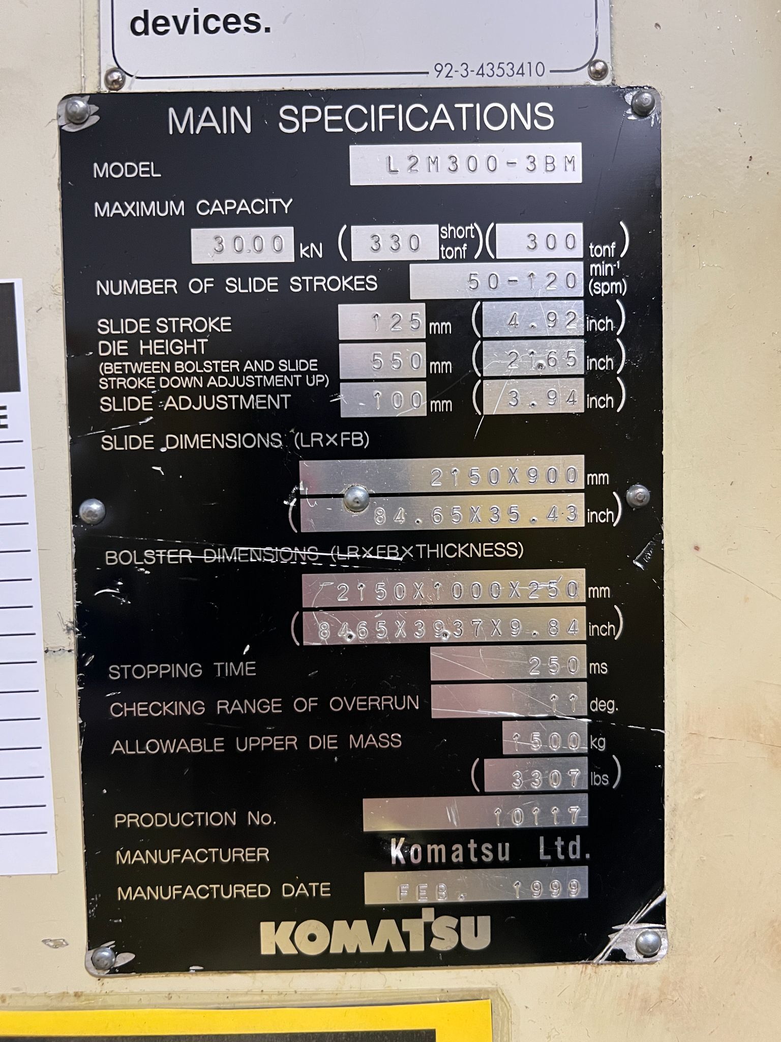 330 Ton, Komatsu #L2M300-3BM, straight side double crank press, 4.9" stroke, 21.65"die height, 3.94"adj., 84.65"x39.37"bed, 50-120 SPM, 35" W x 25.5"H window, air clutch & brake, 1999 Manufacturer: Komatsu Model: L2M300-3BM Year: 1999 Ton: 330 Stroke: 4.9 Air Clutch: Yes Stock # 12369 Request a Quote 9 Play VideoFor Sale by Universal Press & Machinery (UPM) Surplus Record Dealer Since 1977 Contact Seller Ferndale, MI Sales Dept. 248-26...> Show Seller's Phone Number 248-268-1603 Let the seller know you found their listing on Surplus Record! View More Universal Press & Machinery (UPM) 's ListingsDescription (1) Used 330 Ton Komatsu Straight Side Double Crank Press Link DriveCapacity: 330 TonStroke: 4.92"Adjustment: 3.94"Die Height: 21.65"Bed Area: 84.65" lr x 39.37" fbBolster Thickness: 9.84"Ram Area: 84.65" lr x 35.43" fbSpeed: 50 - 120 SPM (variable speed)Windows: 35" Wide x 25.5" HighCapacity: 330 TonStroke: 4.92"Adjustment: 3.94"Die Height: 21.65"Bed Area: 84.65" lr x 39.37" fbBolster Thickness: 9.84"Ram Area: 84.65" lr x 35.43" fbSpeed: 50 - 120 SPM (variable speed)Windows: 35" Wide x 25.5" High Request More Information from SellerGet Your Price from Universal Press & Machinery (UPM)! "*" indicates required fieldsName*Company*Email* PhoneZip / Postal Code*QuestionMake an OfferRequests Send me a shipping quote I am interested in financingSend Copy Email me a confirmation of this inquiryBuyer Protection Use our partner Escrow.com to buy or sell equipment safelyBuyer Protection Send me info about buyer protectionThis field is hidden when viewing the formDealer Email Buyers Who Viewed This Listing Also Viewed … 300 Ton, Niagara #BP2, straight side double crank, 5" stroke, 23" Shut Height, 72" x48" bed, rebuilt ramCategory: Straight Side Double Crank (Single Act...Seller: Alma Machinery Co-Columbia TNLocation: Columbia, TN Mfr: NiagaraModel: BP2CAPACITY300 tONS @ 1/2" OFF BOTTOM STROKE5" MAX SHUT HEIGHT TO BED23" (SDAU) BED AREA72" X 48" (rl x FB) SPEED55 - 110 SPM slide adjustment6" (MOTORIZED) slide area72" RL X 48" FB (T-SLOTTED) - rebuilt slide BOLSTER PLATE6.5" H X 72" RL X 48" FB DISTANCE BETWEEN UPRIGHTS79" DISTANCE BETWEEN OIL CATCHERS73" FLOOR TO ...moreJUST ADDED! 300 Ton, Aida #PMX-L2-300, 72.8" x 40" Die Space, 7.8" Stroke, 40-100 SPMCategory: Straight Side Double Crank (Single Act...Seller: Toledo Press IndustriesLocation: Detroit, MI Mfr: AidaModel: PMX-L2-300AIDA 300 Ton PMX-L2-300(1) Stamping Press; Automator 2 Controls; 40-100 SPM; 1850x1000mm Slide and Bolster Areas; 550mm Max Die Height, S/N 12903-0664, Manufacturer AIDA Model PMX-L2-300(1) Condition Used Capacity 330 US ton Bed area 72.8" x 40" Stroke length 7.8" Die Height 21.6" Slide adjustment (powered) 3.9" ...moreJUST ADDED! 300 Ton, Komatsu #E2G-300U, straight side double crank, 14.2" stroke, 32.2" Shut Height, 10.2" adj., 20-40 SPM, 36" window, 98.4" x 49.2" bed, vibration isolation levelers, Wintriss Smart Pac Control, air clutch & brakeCategory: Straight Side Double Crank (Single Act...Seller: Rygate, LLCLocation: Clarkston, MI Mfr: KomatsuModel: E2G-300UYear: 19901990 KOMATSU E2G-300U, Tonnage. 300 T, Stroke. 14.2", Shut Height. 32.3", Bed area (Left to right). 98.4", Bed area (Front to back). 49.2", SPM min. 20 strokes/min., SPM max. 40 strokes/min., Adjustment. 10.2", Windows Width. 36", Vibration Isolation Levelers, Hydraulic Overloads, Hydraulic (Air Actuated) Clutch/Brake ...moreJUST ADDED! 300 Ton, Komatsu #E2G-300U, Straight Side Mechanical Press, 98.4" x 49.2" bed & ram, 32.3" shut height, 10.2" adjustment, 14.2" stroke, 20-40 SPM, 1990Category: Straight Side Double Crank (Single Act...Seller: S & G Press & Machinery SalesLocation: Shelby Township, MI Mfr: KomatsuModel: E2G-300UYear: 1990Tonnage 300, Stroke 14.2 inches, Shut Height 32.3 inches, Adjustment 10.2 inches, Bed Size 98.4 LR x 49.2 FB, Ram Area 98.4 LR x 49.2 FB, SPM 20-40 VSPM, 300-ton Komatsu Model E2G-300U, Straight Side Mechanical Stamping Press, Year 1990 Standard, 300-ton US Capacity, Rated @ 1/2" Off Bottom Dead Center, 14.2" Stroke ...more 300 Ton, Minster #E2-300-60-36, straight side double crank press, 6" stroke, 32" Shut Height, 6" ram adj., 120 SPM, 60" x36"bed, air clutch & brake, 23" window, 1991Category: Straight Side Double Crank (Single Act...Seller: D & D Industries IncLocation: Monclova, OH Mfr: MinsterModel: E2-300-60-36Year: 19916" Stroke, 6" Ram Adjustment, 32" Shut Height, 0-120 Spm, 60" x 36" Ram, 60 x 36" Bed, Air Clutch, Air Brake, Air Counterbalances, 23" Windows, Floor Standing, Palm Buttons, T - Slotted Ram And Bolster, 6" Extra Bolster Plate, 129" LR x 98" FB x 209" Tall, Estimated Weight 90,000 LBS.Share × "*" indicates required fieldsYour Name*Your Email* Recipient's Email* Note to Recipient
