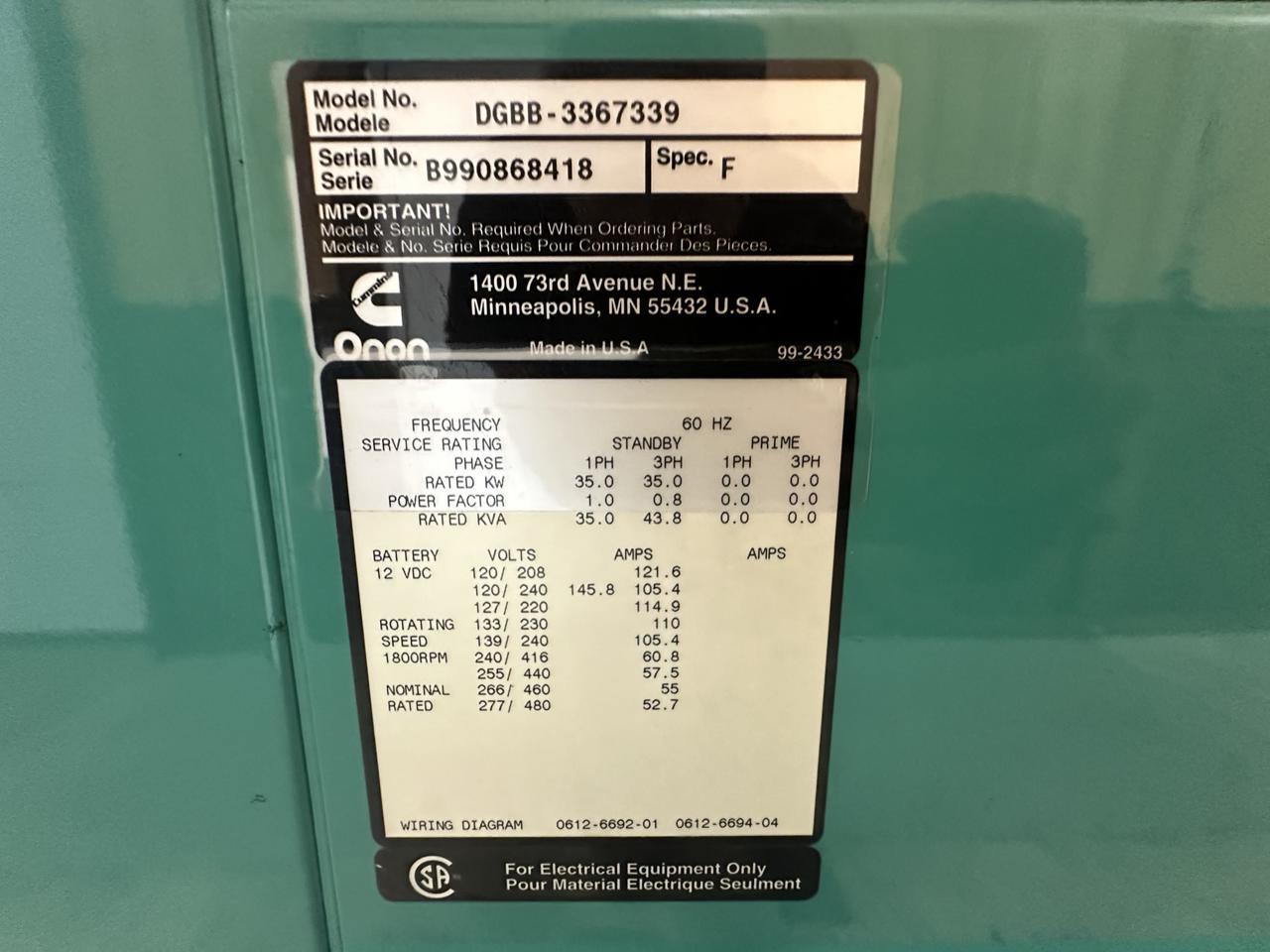 Stock#: IE35-268-CU Fuel: Diesel Year: 1999 Voltage: 120/240 Volts Hours: 4097 Hours Phase: 1/3 Phase Make: Cummins/Onan Model: DGBB-3372606 Serial: E990914351 Hertz: 60 Hz Wires: 12 Lead Kilo Watts: 35 kW Mounted: Skid Mounted Lead: Reconnectable Length: 83" Width: 41" Height: 51" Weight: 3000 lbs ...more