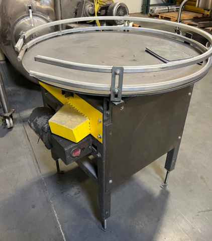 Accumulation table, 36" diameter, Model F044A. With side rails,driven by 1/4 HP motor, 3 phase, 60 Hz 1750 RPM, 208-230/460V. Complete with outfeed conveyor measuring 2'8" long x 4" wide. (2) 1 HP, 3 phase, 60 Hz 1750 RPM, 208-230/460V electric breaks. Diameter: 36"., Diameter: 36", Basis: FOB.