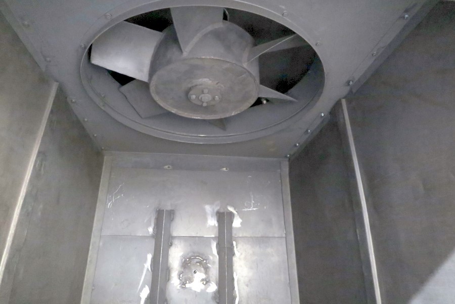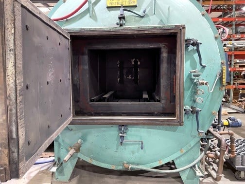 HORIZONTAL DOUBLE WALL WATER COOLED CHAMBER WITH SINGLE SIDE SWING BOLT DOWN FRONT DOOR. VACUUM PUMPS EVACUATE THE VESSEL WHICH IS THEN BACK FILLED WITH NITROGEN. HEAT IS SUPPLIED BY COIL TYPE HEATING ELEMENTS BEHIND A PROTECTIVE SCHROUD. HEATED AIR IS CIRCULATED BY A ROOF MOUNTED FAN