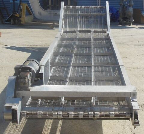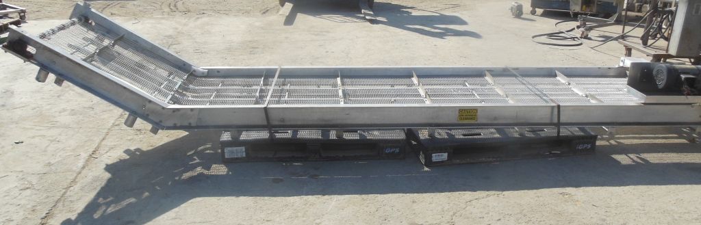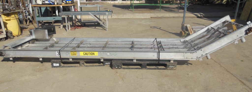 Stainless steel belt conveyor, 36" wide x 12'6" straight, flat wire mesh belt, stainless steel construction, includes, 40", 30-degree incline section. Belt openings: 7/16" x 1-5/8". Spacing between belts: 4-5/16", infeed: 12", and 32" discharge height, mounted on aluminum frame. Driven by 1/2 HP, 230/460 Volt, 1725 RPM, 3/60Hz through reducer, ratio 20:1, final output 86 rpm.