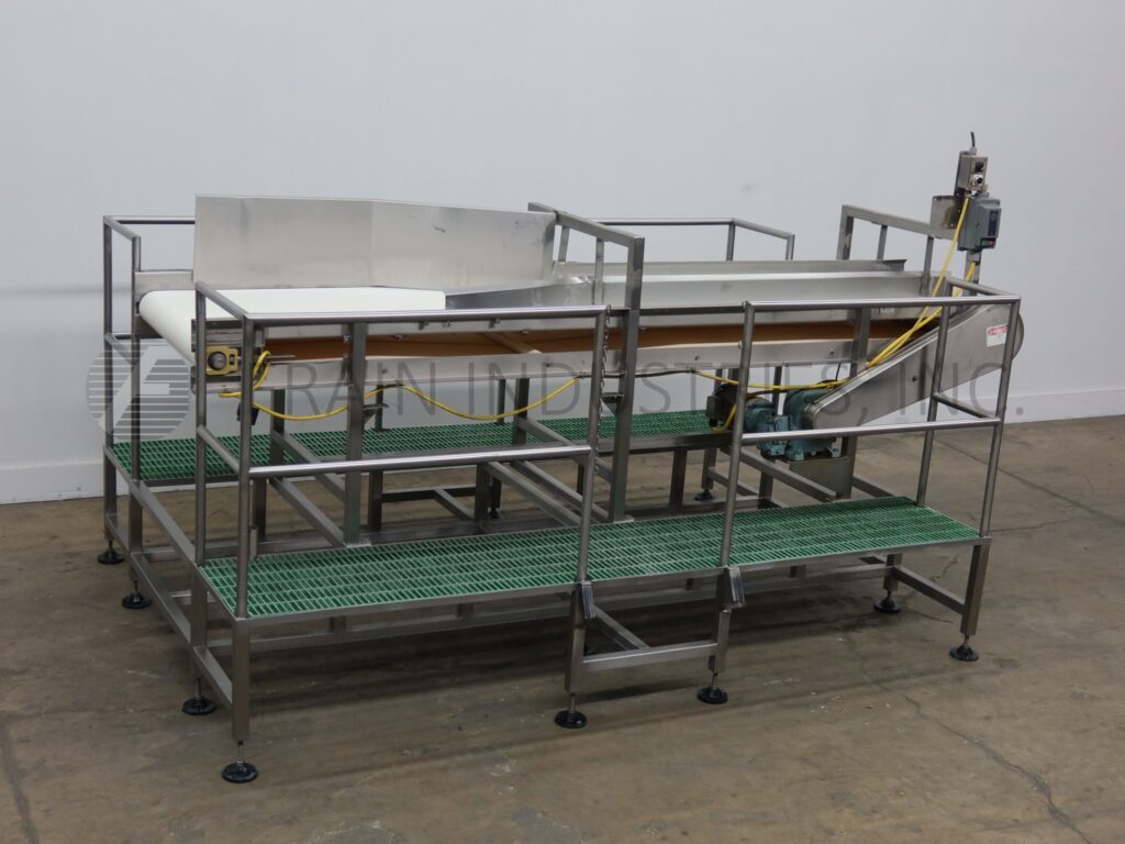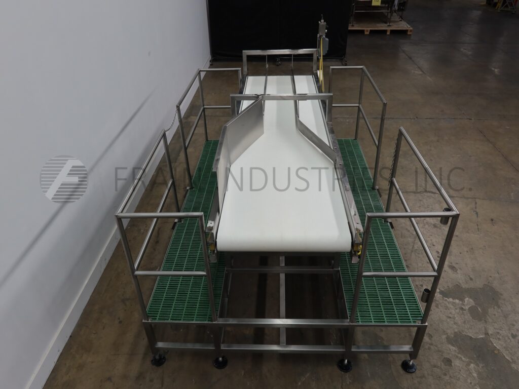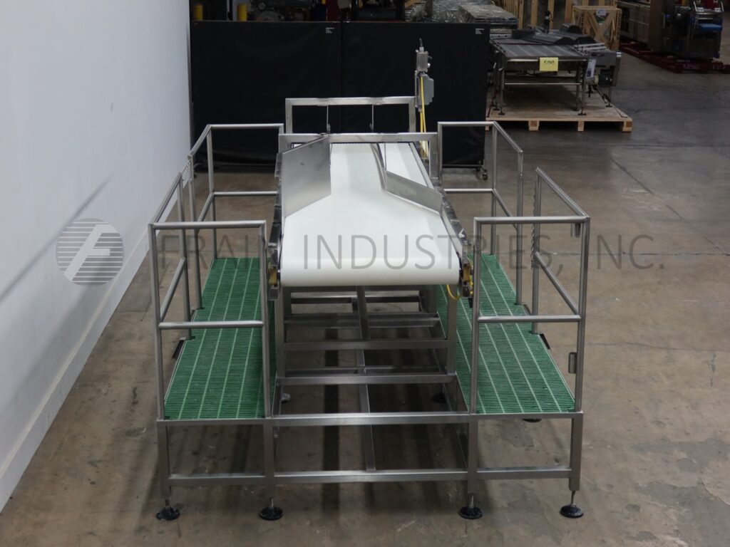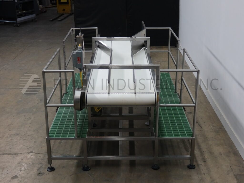 Stainless steel belt conveyor with double sided platform. Equipped with a 36" wide x 144" long belt with an infeed height of 55½" and (2) 23" wide x 132" long platforms with 42" high guard rails.