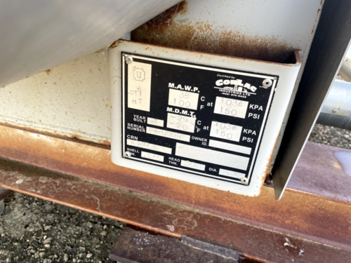Available for sale: A horizontal sweet service equipment manufactured by CORLAC INDUSTRIES in the year 2000. This unit s a diameter of 36 inches and a length of 55 feet, with an operational status marked as connected. It is rated for a maximum temperature of 212°F and pressure up to 100 PSI. Located in ...more