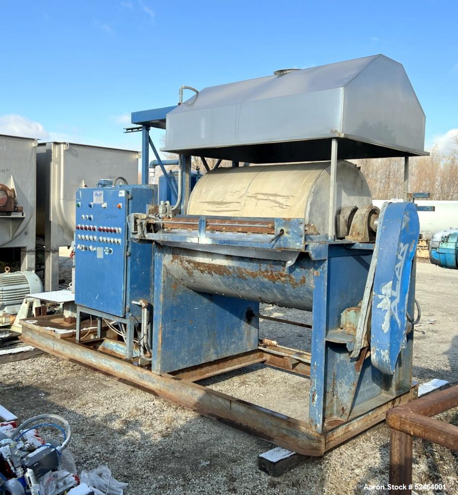 used- alar auto-vac rotary vacuum filter system, model 340. 36" diameter x 48" face 304ss drum, approximately 37.7 square feet nominal filtering area. drum driven by an approximate .4hp, 1750 rpm gear motor, 288 to 1 ratio. dry solids discharge with adjustable knife. bottom holding tank with rake agitator, driven by a .33hp, 3/60/208-230/460 volt, 1140rpm motor. receiver tank with pump, pump driven by a 1-1/2hp, 3/60/208-230/460 volt, 3450rpm motor. control panel with allen bradley slc plc. total connected horsepower 13. all unitized on a common carbon steel frame. serial# 13121.