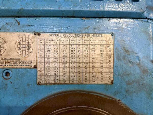 SERIAL. 3A, MODEL. 3A, BASE AREA. 53" X 42", SPINDLE SPEEDS. (36) 10 TO 1000 RPM, THREADS. 8, 11-1/2, 14, 18 TPI, SPINDLE DIAMETER. 3-3/16", SPINDLE TRAVEL. 18", TAPER IN SPINDLE. #5 MT, DISTANCE SPINDLE TO COLUMN. 15" MINIMUM 48" MAXIMUM, DISTANCE SPINDLE TO BASE. 28" MINIMUM 60" MAXIMUM, POWER ELEVATION. YES, POWER ...more