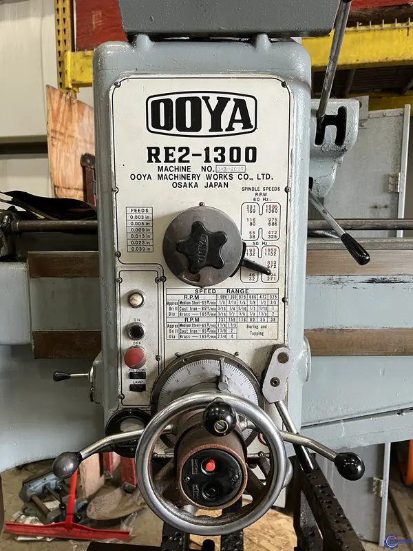 Overview, Type:Radial DrillsManufacturer:OOYAModel:RE2-1300Stock #:1873Status:For Sale, FOB Rock Springs WY, ImperialMetricArm Length 4' 1.2 m Column Dia. 13.38" 339.85 mm Power 7.5 hp 5.6 kW RPM 1,985 RPM 1,985 RPM DIAMETER OF COLUMN. 13-3/8", LENGTH OF ARM. 48", AREA OF BASE. 54" X 29", T SLOTS, SPINDLE ...more