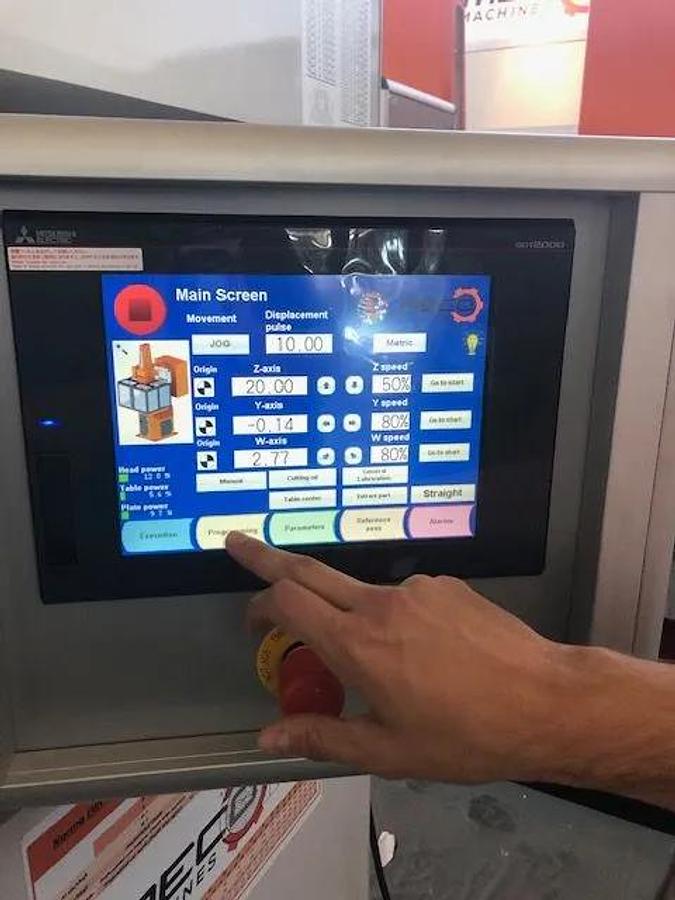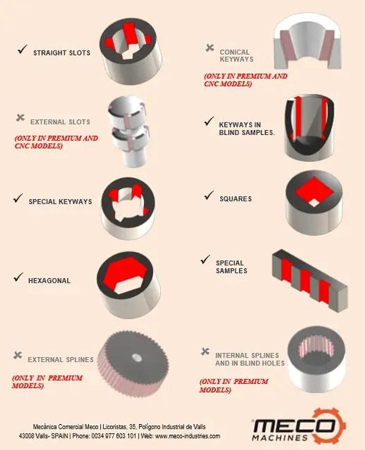 2025 MECO MEC-80 CNC Premiun keyseater 3 AUTOMATIC AXES, 17.7" z stroke Thanks to the electronic control systems of last generation that have been incorporated in this model for its three axes is achieved greater precision and a higher degree of automation. The machine can work in automatic mode, so that the operator can simply handle replace the part once the machine has finished the process of pre-programmed machining. Undoubtedly, the MECO broaching machines are designed to increase the production capacity of our customers. LOWER GUIDED SYSTEM Z AXIS. Through a removable guide bar running through a clamping sleeve located at the bottom, we set the Z axis. As a result we suppress the bending of the shaft and the tool holder, and thus we cut absolutely straight and precise. This system allows us to remove more material in each pass and thus greatly shorten production times. Main characteristics: Vertical stroke adjustable from 0 to 440 mm directly with the touch screen. Keyway width from 3 to 100 mm according to current regulations (or other dimensions under request). Working table with room for samples up to 800 mm diameter (approx), equipped with an Automatic dividing plate for executing multiple keyways in samples (multi slots, gears, external slots…). Includes: servo-engine controlled from the touch screen, electronic equipment by CPU. Total range of division: 360º. 2 HP-Servo-engine with the electrical security equipment. Automatic system by means of servo-engine equipment for: approximation of the tool to the sample (initial working point) and adjust of the stroke and separation of the tool from the sample each time working cycle begins. Adjustable from 0 to 1,5 mm. CNC control for the main servo-engine and for the working table. CNC advantages: - Conical keyways mechanization in blind holes or through samples (with the appropriate software). - Regulation of the vertical stroke. - Vertical stroke adjust tolerance of +/-0,05 mm. - Regulation of the main stem working speed. - Regulation of the translation working speed. - NC control over the keyway depth. - All the functions can be adjusted from the touch screen. - Select user language. - Select different working units (pounces or S.M.I.). Standard Equipment Complete Electrical Panel UL Approved Siemens and Omron Electrical Components 14-1/8” Built-In Rotary Table 360 Degree Rotary Scale Upper and Lower Adjustable Stroke Limits Cutter Retract During Upstroke Electrically Interlocked Safety Guards Omron PLC Premium Version differences Brake motor is replaced with servo motor NC control of cutter stroke and servo motor NC control of table infeed increment and depth, program storage of 10 jobs, programmable safety clearances for stroke and table, programmable cutter retract during non-cutting up stroke, UL approved electrical panel, Mitsubishi PLC, wired for 220V or 440V/60Hz/3Ph operation Machine Dimensions Highly Recommended Options Lower guide/support for long keyways (note: requires special holder for use with lower guide)… $1,743.00 The centering fixture is highly recommended for centering on a I.D. bore during set-up. The lower guide for very long slotting. The cutters are paired with individual toolholders by size. Special for longer centers or special widths are the same price as normal cutters. Special toolholders are 35% higher.
