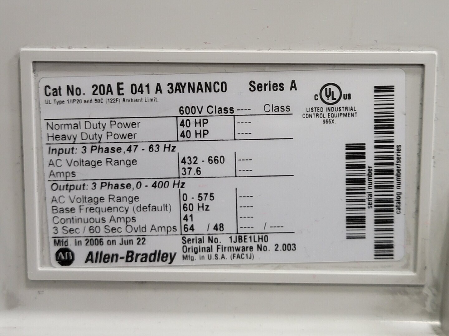 SKU: 138831, Model: ACS550-U1-041A-6, Condition: Used, Electrical :, Horsepower: 40 hp, Voltage: 600 volts, Phase: 3-phase, Amps: 41 amps, Dimensions: 10.00 (H) x 8.00 (W) x 22.00 (L) inches, Additional :, Input: 3ph, 48-63 Hz, Voltage: 500-600 VAC, Current: 41A, Output: 3ph, 0-500 Hz, Voltage: 0-600 VAC, Current: ...more