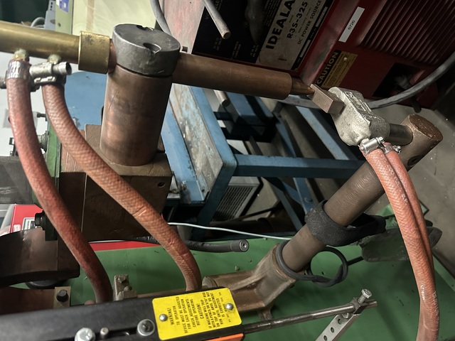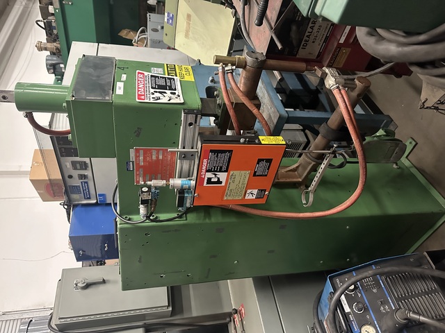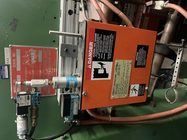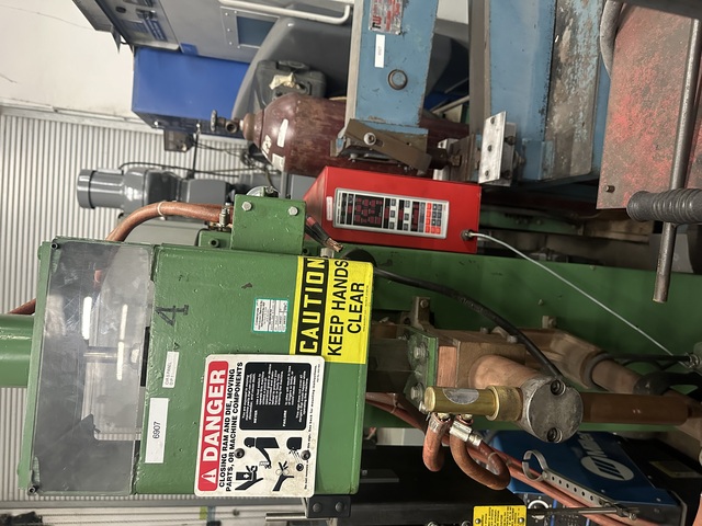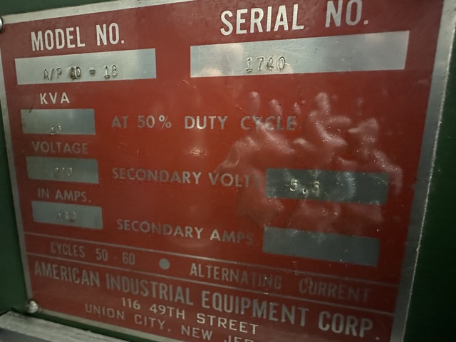 “Normal wear from use. While an older machine, it seems to be in good shape and we warrant it against all latent defects.”, 50 KVA Spot Welder, “Ames” 24 in arms, water cooling, (made in USA), Max. capacity. 50 KVA, Throat depth. 24” x 8” H., Cooling. Yes, water flow, Electrics. 550 ...more