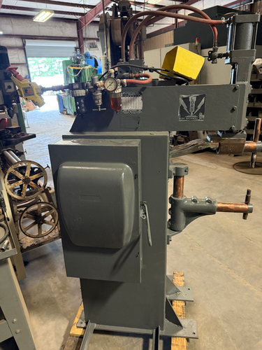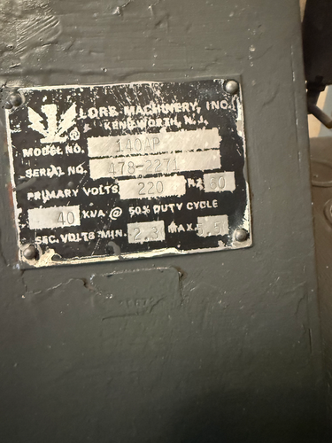 “Normal wear from use. While an older machine, it seems to be in good shape and we warrant it against all latent defects.”, 50 KVA Spot Welder, “Ames” 24 in arms, water cooling, (made in USA), Max. capacity. 50 KVA, Throat depth. 24” x 8” H., Cooling. Yes, water flow, Electrics. 550 ...more