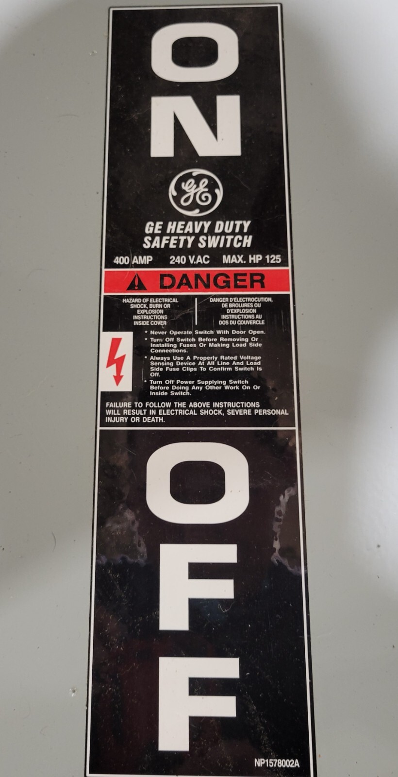 GE heavy duty safety switch 400 amp, 400 amp switch GE NP1578002B, Type 1, 4, 4X, 5, 12, Enclosure, Catalog # THN3365SS, unused, 400 amp stainless steel disconnect, GE Heavy Duty safety switch 400 amp 600 V.AC, HP 350, UL listed, Type 1, 4, 4X, 5, 12, Enclosure Suitable for use as Service equipment, Catalog # ...more