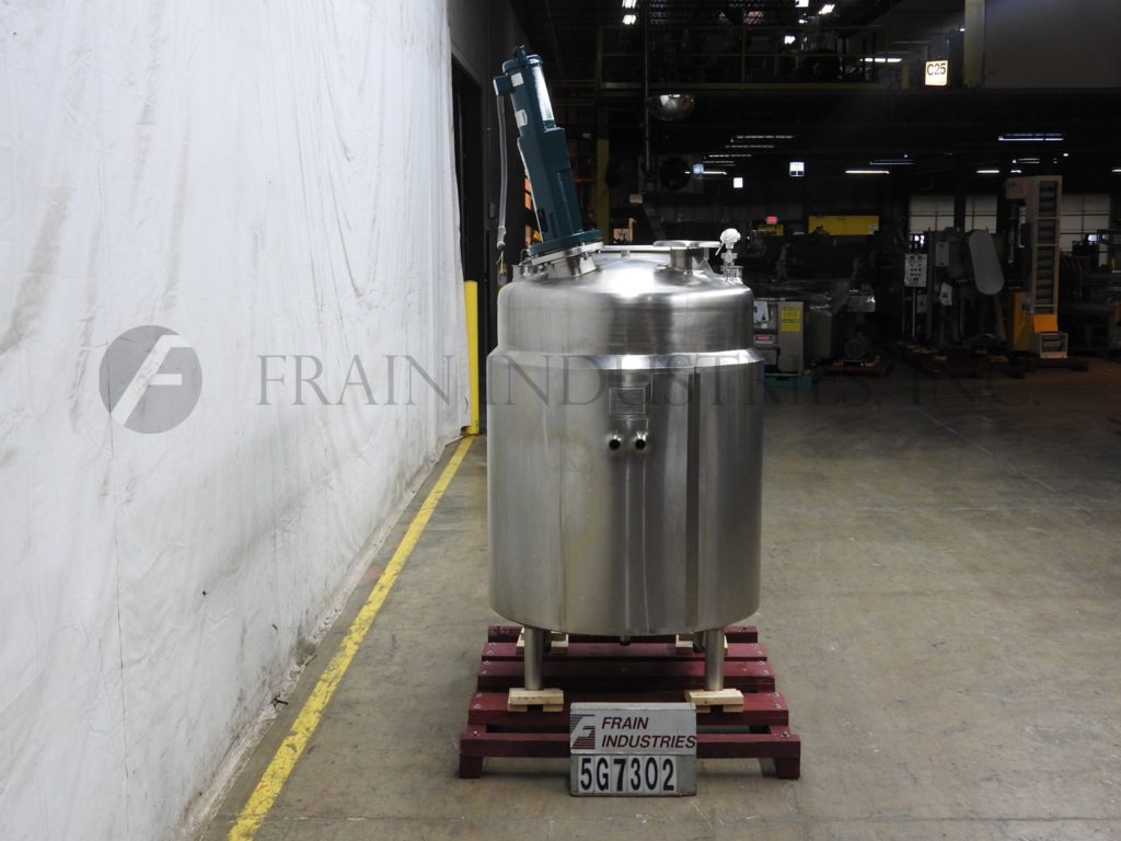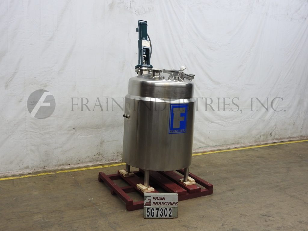 Feldmeier, 300 gallon working capacity, 304 stainless steel jacketed and insulated tank. Vessel dimensions: 48" diameter x 52" deep with slant bottom. Equipped with a 24" x 16" manway with flip up cover, (2) level sensors, 44" x 2" sight glass and 3 Hp top mounted prop agitator. Unit mounted on (4) legs with a 3½" OD / 3" ID Tri-clamp style front discharge with 15" ground clearance.