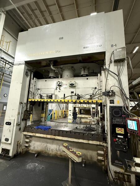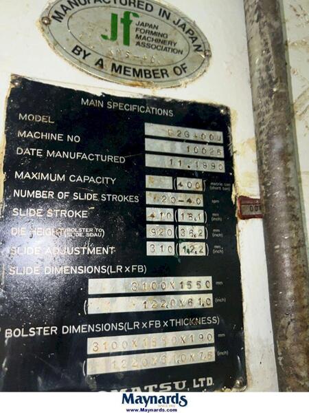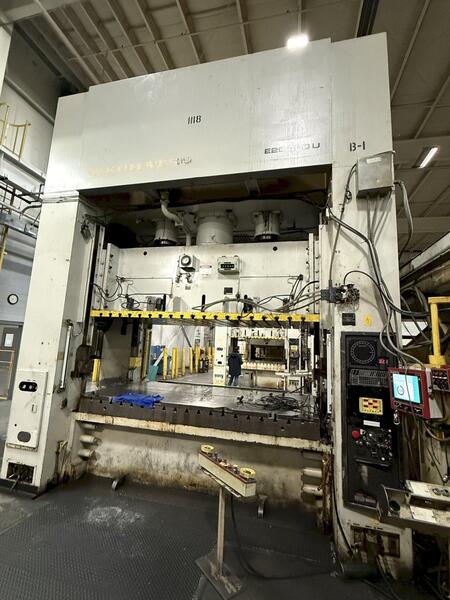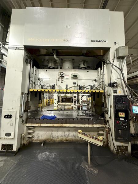 400 Ton, Komatsu #E2G-400, Straight Side Mechanical Stamping Press, 122" x 61" bed & ram, 36.2" shut height, 12.2" adjustment, 16" stroke, 20-40 SPM, 1990 Manufacturer: Komatsu Model: E2G-400 Year: 1990 Ton: 400 Stroke: 16.0 Shut Height: 36.2 Stock # 2989 Request a Quote 10 Play VideoFor Sale by S & G Press & Machinery Sales Surplus Record Dealer Since 1996 Contact Seller Shelby Township, MI Sergio Gasperoni 586-56...> Show Seller's Phone Number 586-563-5000 Let the seller know you found their listing on Surplus Record! View More S & G Press & Machinery Sales ' ListingsDescriptionSpecificationsTonnage400Stroke16.1 inchesShut Height36.2 inchesAdjustment12.2 inchesBed Size122" LR x 61" FB Bed AreaRam Area122" LR x 61" FB Slide AreaSPM20-40 VSPM400-ton Komatsu Model# E2G-400Used Straight Side Mechanical Stamping PressYear 1990Standard Specifications 400-ton CapacityRated @ .5" Off Bottom16.1" Stroke36.2" Shut Height On Bolster43.2" Shut Height On Bed12.2" Adjustment122" LR x 61" FB Bed Area122" LR x 61" FB Slide Area20-40 VSPMEquipment and FeaturesHydraulic (Air Actuated) Clutch and BrakeAir CounterbalancesRecirculating Lubrications SystemT-Slotted Ram and Bolster7.5" Thick Bolster PlateHydraulic OverloadsVariable Speed MotorWintriss Smart Pak Pro Press ControllerDSI 2 Wintriss Die Protection (8 Inputs)Wintriss Light CurtainsWintriss Palm Button Station75 HP Main Motor480V / 60 HZ / 3 Phase42" Wide WindowsVibro Dynamic Isolation PadsFloor StandingDimensions21' 1" Overall Height180" LR x 128" FB FootprintCan be seen under power in the S&G Press Livonia Michigan Warehouse! Optimize your production capacity with this 400-ton Komatsu E2G-400 Straight Side Mechanical Stamping Press. This 1990 floor-standing press offers a massive 122" x 61" bed and slide area, a 16.1" stroke, and a variable speed of 20-40 VSPM.Engineered for precision and heavy-duty output, it features a 75 HP main motor, 8-point gibbing, and a Wintriss Smart Pak Pro controller with 8-input die protection. This used Komatsu press is fully equipped with hydraulic overloads, Vibro Dynamic isolation pads, and 42" wide windows, making it a turnkey solution for high-capacity metalforming and stamping operations.Why Buy This Komatsu 400-Ton From S&G Press?Purchasing a 400-ton machine is a significant investment. At S&G Press, we remove the guesswork from the process by offering unique advantages that most equipment brokers can't match:See It Under Power: This machine is located in our Livonia, Michigan warehouse and is available for inspection under power. We want you to see the smooth cycle, hear the motor, and verify the Wintriss controls yourself before you commit.Zero Foundation Costs: This is a floor-standing unit. Unlike many 400-ton presses that require expensive, permanent pit excavations, this E2G-400 can be installed directly on your factory floor, saving you tens of thousands in facility prep.Complete Package with Extras: We include high-value add-ons like Vibro Dynamic Isolation Pads and Wintriss Light Curtains, ensuring your installation is safe, stable, and compliant from day one. Request More Information from Seller See this Straight Side Double Crank (Single Action) Press Machines listing on S & G Press & Machinery Sales' websiteGet Your Price from S & G Press & Machinery Sales! "*" indicates required fieldsName*Company*Email* PhoneZip / Postal Code*QuestionMake an OfferRequests Send me a shipping quote I am interested in financingSend Copy Email me a confirmation of this inquiryBuyer Protection Use our partner Escrow.com to buy or sell equipment safelyBuyer Protection Send me info about buyer protectionThis field is hidden when viewing the formDealer Email Buyers Who Viewed This Listing Also Viewed …JUST ADDED! 440 Ton, Komatsu #E2G-400U, straight side double crank, 16" stroke, 36" Shut Height, 12" adj., 42" window, 20-40 SPM, 122" x 61" bed, Wintriss Smart Pac Pro Control, air clutch & brake, 1990Category: Straight Side Double Crank (Single Act...Seller: Rygate, LLCLocation: Clarkston, MI Mfr: KomatsuModel: E2G-400UYear: 19901990 KOMATSU E2G-400U, Tonnage. 440 T, Stroke. 16", Shut Height. 36", Bed area (Left to right). 61", Bed area (Front to back). 122", SPM min. 20 strokes/min., SPM max. 40 strokes/min., Adjustment. 12", Windows Width. 42", Vibration Isolation Levelers, Hydraulic Overloads, Hydraulic (Air Actuated) Clutch/Brake ...more 440 Ton, Minster #GM2-400-305x140-STD, straight side double crank 2-pt mechanical press, 15.7" stroke, 35.4" Shut Height, 13.8" adj., 55" x120" bed, 120 SPM, 55" x120" bed, 2024, newCategory: Straight Side Double Crank (Single Act...Seller: Nidec Press & AutomationLocation: Macomb, MI Mfr: MinsterModel: GM2-400-305X140-STDYear: 2024SPM 120, Tonnage 440 tons, Stroke 15.75 inches, Shut Height 35.43 inches, Vari Speed (Yes/No) yes, Bed W 55 inches, Bed L 120 inches, Crank (Single/Double) double, Press, Model Number. GM2-400-305x140-STD, Force × Distance off Bottom. 4000 kN x 6 mm (440 tons x 0.24 in.), Energy (with 15% slowdown). 25 kJ (110.6 ...more 400 Ton, Blow #Progressive, straight side press, 16" stroke, 30" Shut Height, 40 SPM, vari-speedCategory: Straight Side Double Crank (Single Act...Seller: Galaxie CorporationLocation: Wayne, MI Mfr: BlowModel: PROGRESSIVE 400 Ton, Blow, 16" stroke, 20-40 SPM, 120" x 60" bed, Windows, floor standing, under powerCategory: Straight Side Double Crank (Single Act...Seller: Ball Bros Machinery LtdLocation: Cambridge, ON Mfr: BlowYear: 1988BLOW 400 TON SS PRESS, Model SC2-400-120-60, Capacity – 400 Tons, Bed: 120” x 60”, Stroke: 16”, Strokes per minute: 20-40 (Variable), Shut height: 30” (SDAU), Adjustment: 10”, Windows – 50” wide, Air Clutch & Brake, Flush-Floor design, Year - 1988.JUST ADDED! 400 Ton, Chicago Dreis & Krump, straight side double crank pressCategory: Straight Side Double Crank (Single Act...Seller: Perfection Industrial SalesLocation: New Haven, MO Mfr: Chicago400 Ton Chicago Dreis & Krump.Share × "*" indicates